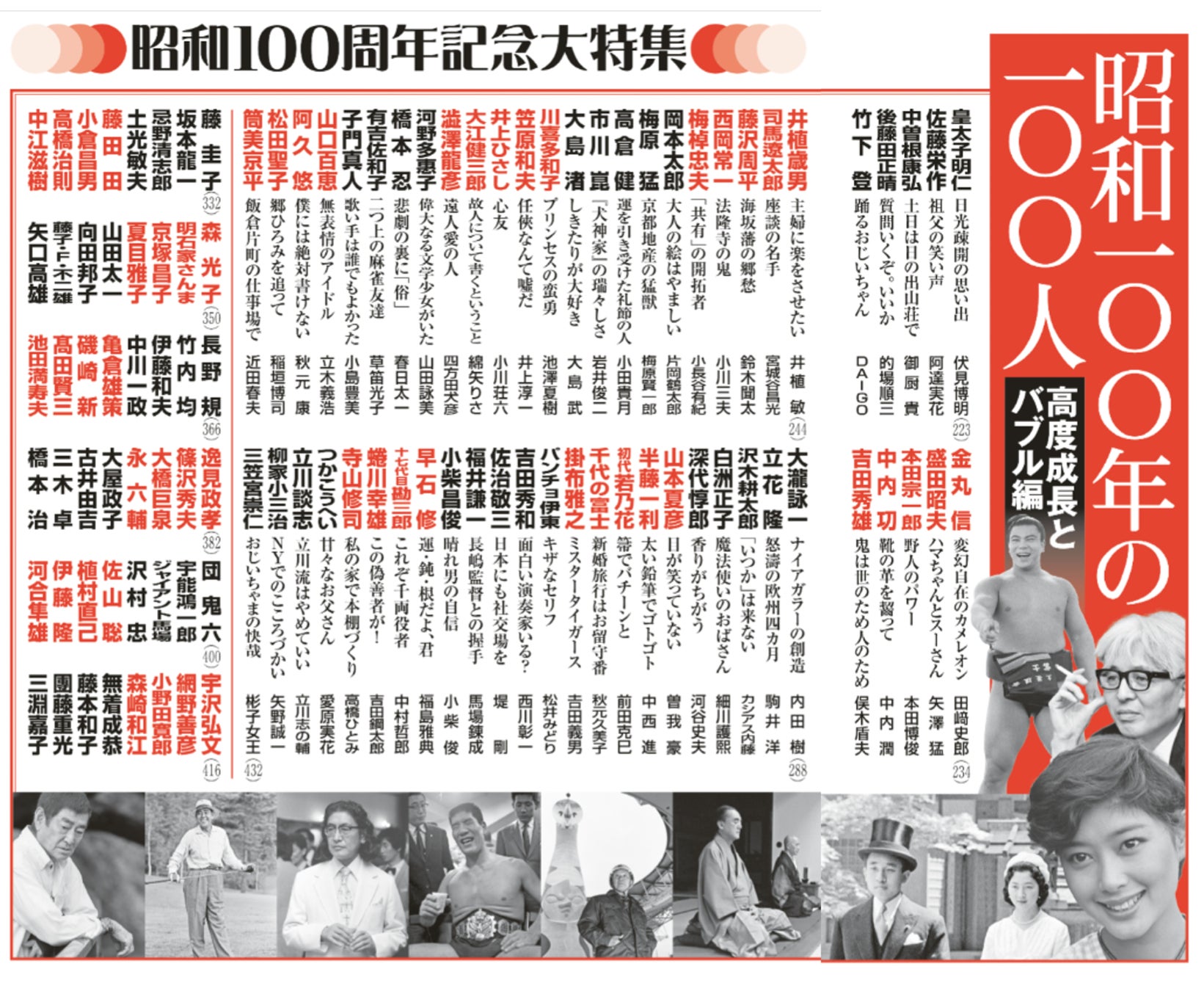 「昭和100年の100人-高度成長とバブル編-」を掲載。