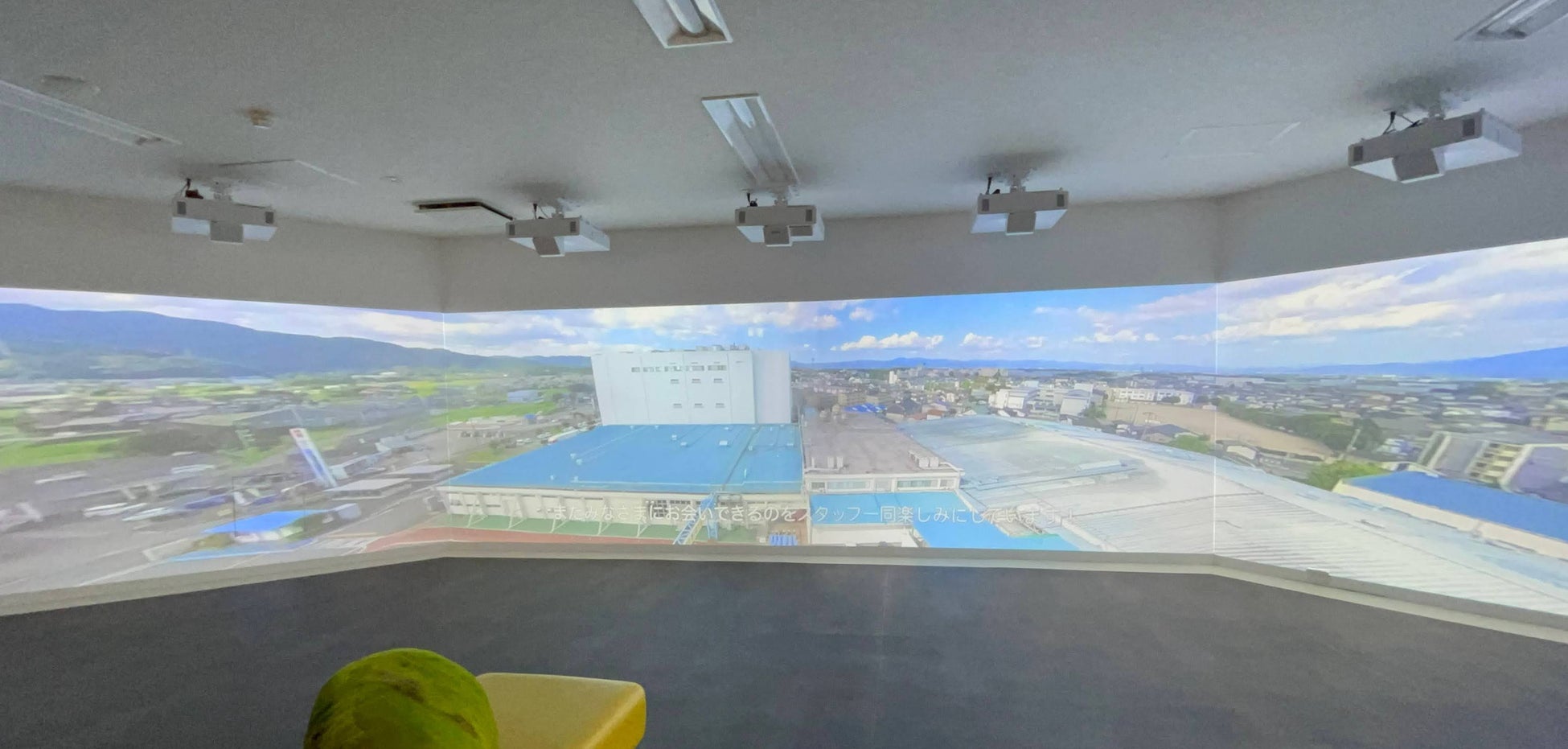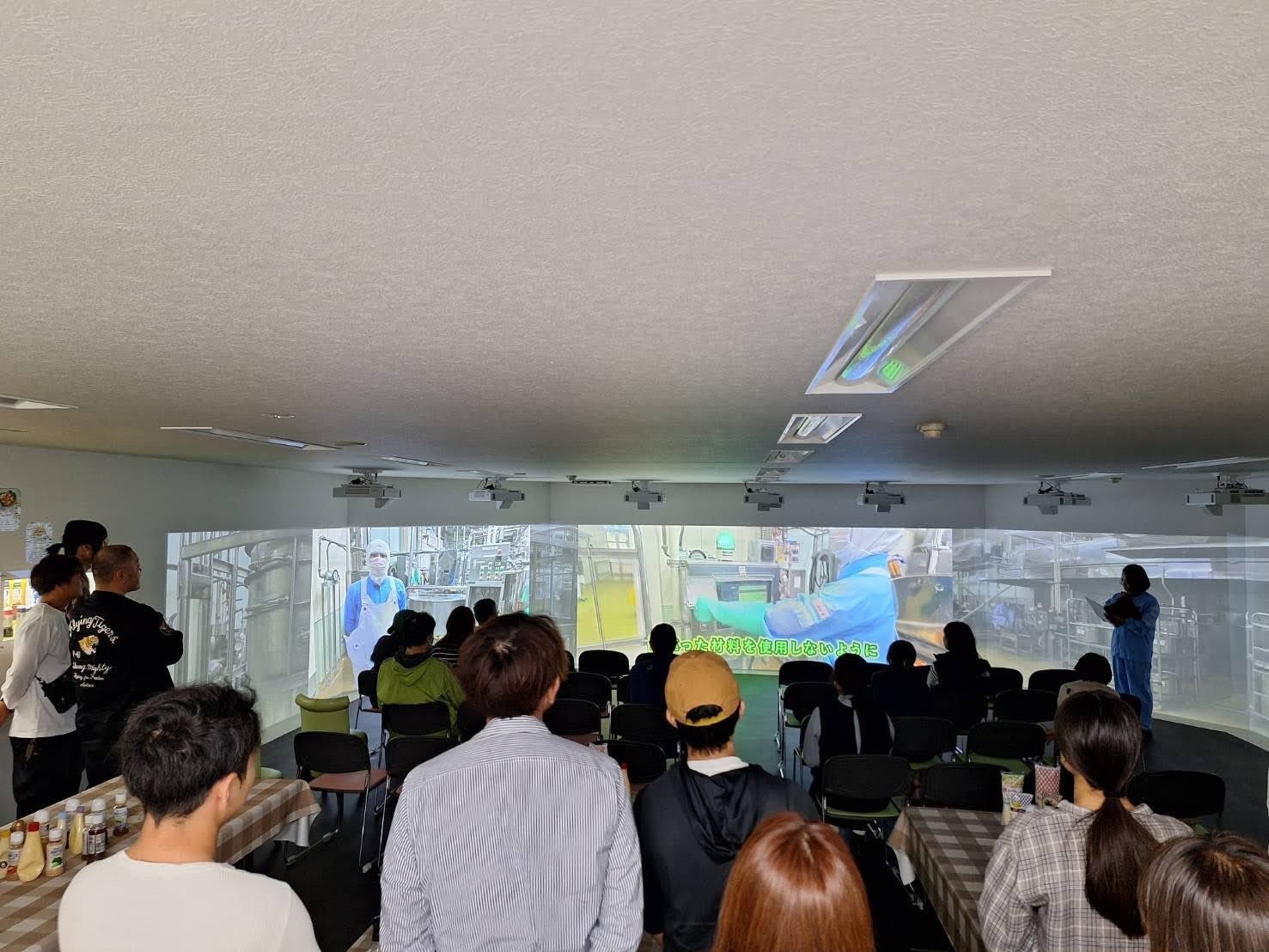 鳥栖工場では、2024年10月に新たな取り組みとして、バーチャル見学施設「スクリーンT」が公開されました。360度カメラで撮影した製造過程の映像を6つのプロジェクターを使用し、壁に投影することで、まるで加工場に入ったような感覚を体験できます。鳥栖工場でしか製造していないベビーフードの製造過程も没入感のある映像を通して紹介し、安全安心な商品づくりの仕組みを伝えています。