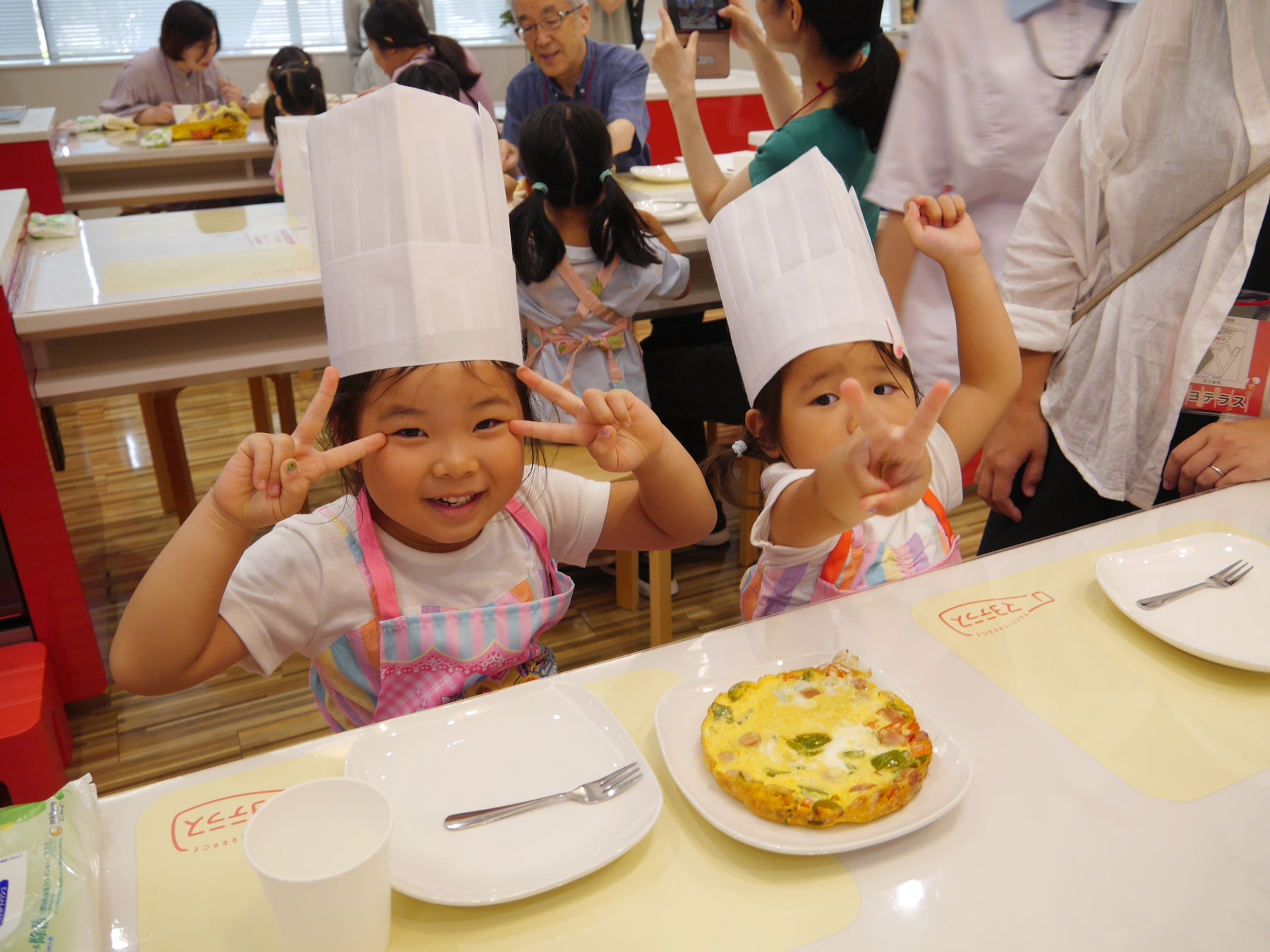 マヨテラスでは、「子どもたちが笑顔でピーマンを食べ、もっと野菜を好きになってもらいたい」という願いを込め、幼児向けイベント「ピーマンチャレンジ!」を企画しました。ピーマンとマヨネーズを一緒に食べると、マヨネーズの中の卵黄がピーマンの苦みを抑え、食べやすくなるというキユーピーの研究成果をもとに、イベントではマヨネーズでピーマンをソテーし、オープンオムレツを作りました。