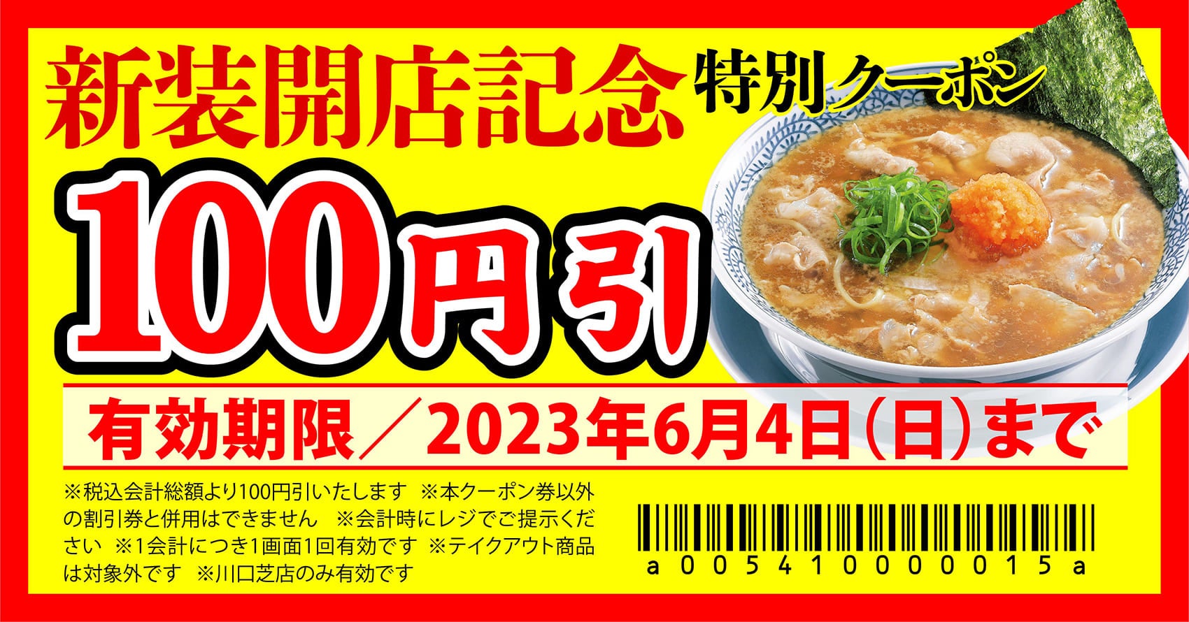 株式会社物語コーポレーション(本社:愛知県豊橋市/代表取締役社長:加藤 央之)が運営する『丸源ラーメン』は、2023年5⽉24日(水)に、『丸源ラーメン 川口芝店』(埼玉県川口市)を新装開店いたします。オープン記念として、2023年6月4日(日)まで『丸源ラーメン 川口芝店』のみでご利⽤いただける100円引クーポンを配布します。