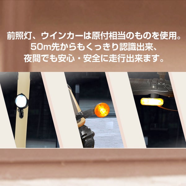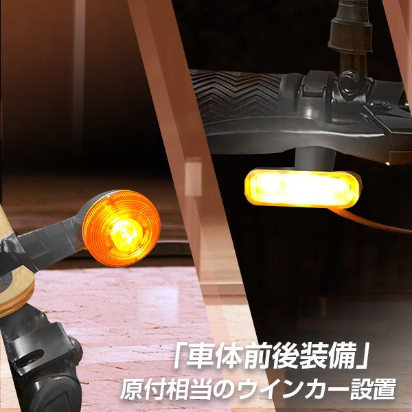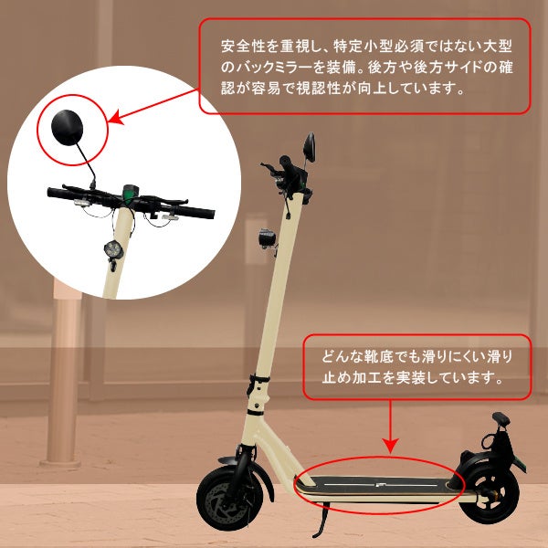 約5.5時間の充電で約30kmの走行が可能で経済的。環境にも優しいモビリティです。明るく大きな前照灯やウィンカーは、最大50mの距離からでも認識可能な見やすい設計となっており安全です。8.5インチのノーパンクタイヤはスムーズで安定感のある走行を実現。盗難防止用ワイヤーロックが装備されており駐輪時も安心です。前輪にはディスクブレーキ、後輪にはドラムブレーキが採用されており安定した制動力を提供。更に大型のバックミラーが搭載され視認性が向上しています。