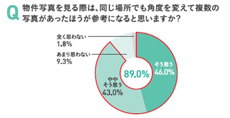 同じ場所でも角度を変えて複数の写真があったほうが参考になるか聞いたところ89.0%が「そう思う」「ややそう思う」と回答しました。内見をする前にできるだけ情報を収集したい意向が表れています。