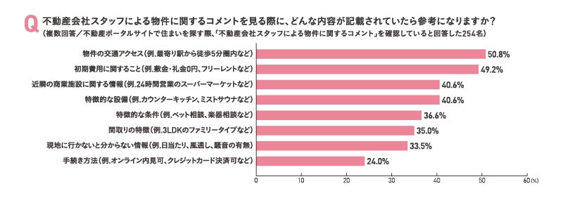不動産会社スタッフによる物件に関するコメントとして参考になると思うものは「物件の交通アクセス」が50.8%、次いで「初期費用に関すること」49.2%、「近隣の商業施設に関する情報」「特徴的な設備」40.6%と続きました。