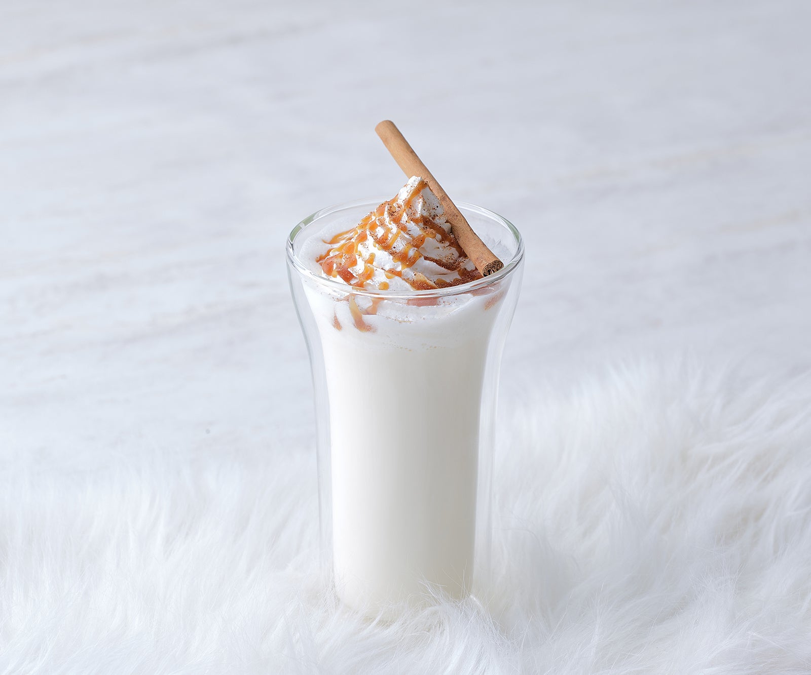 ミルクにバニラアイスを溶かして混ぜ、シナモンシロップを加え作ったエッグノッグに、ホイップクリームをのせてキャラメルソースとシナモン、ナツメグパウダーで香り付けしたノンアルコールのホットドリンク。思わ「ほっ」となるようなクリスマスにぴったりの一杯です。