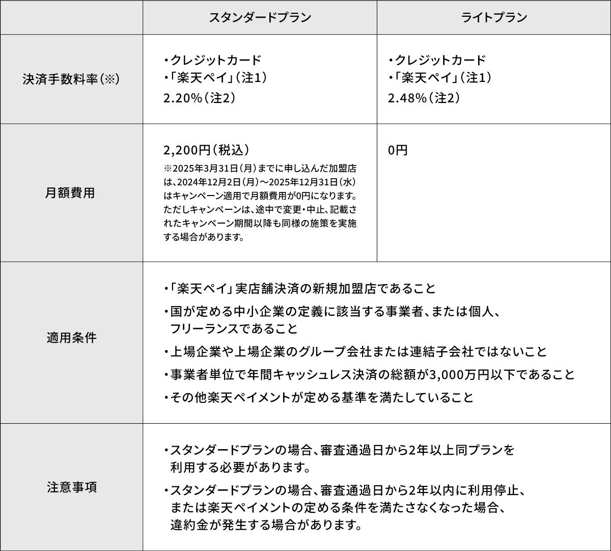 最強プランは、中小事業者のニーズに合わせて利用できるよう、月額費用を支払うことで「楽天ペイ」(注1)およびクレジットカードの決済手数料率が2.20%(注2)になる「スタンダードプラン」と、月額費用の支払いがなく「楽天ペイ」(注1)およびクレジットカードの決済手数料率が2.48%(注2)になる「ライトプラン」の2種類から選べます。「スタンダードプラン」においては、2024年12月2日(月)から2025年12月31日(水)まで月額費用が無料になるキャンペーンを実施します(注6)。
