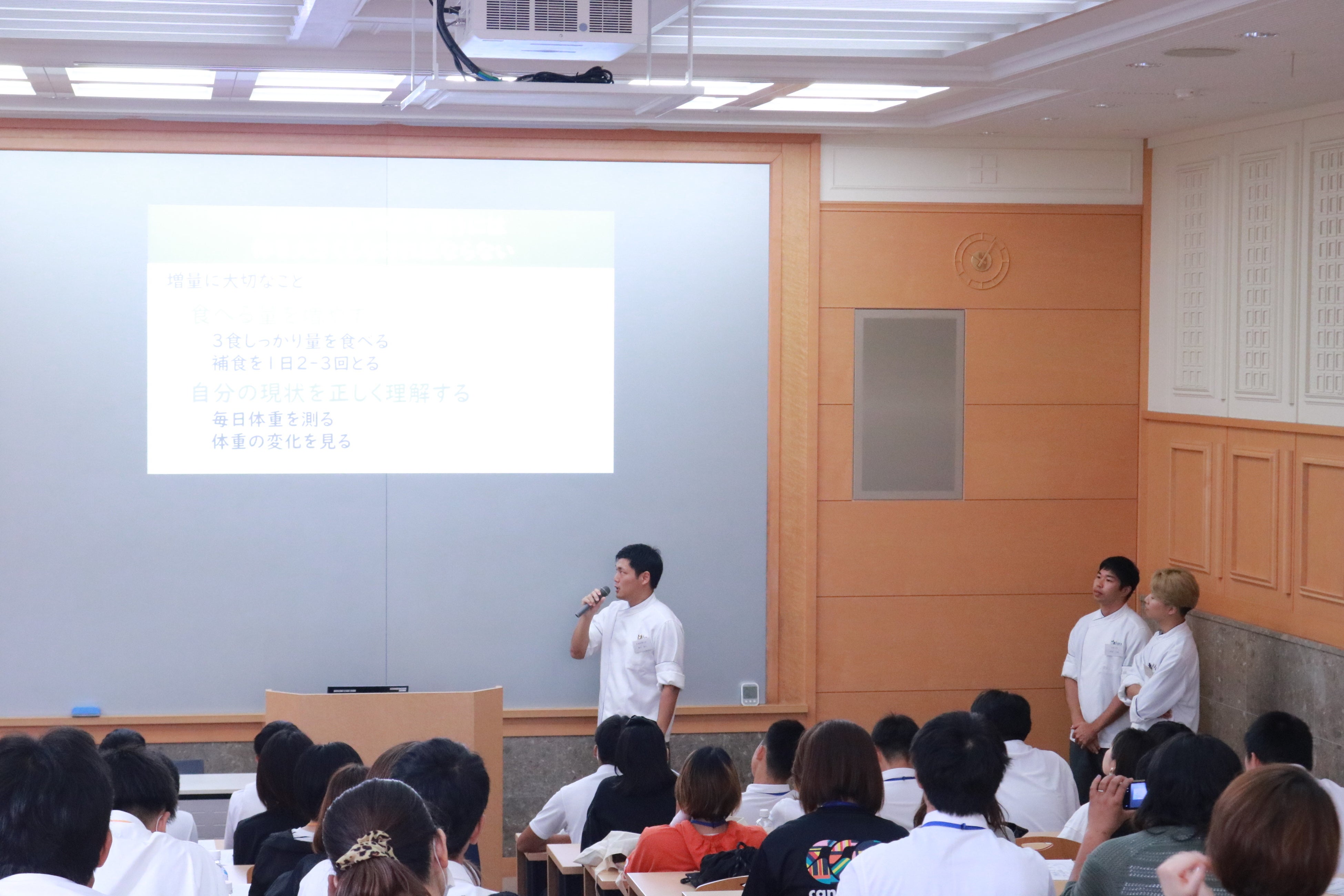 スポーツにおける身体づくりの食事を中心に、基本的な栄養の知識と体重を増やす、増量の確認方法などをレクチャー。