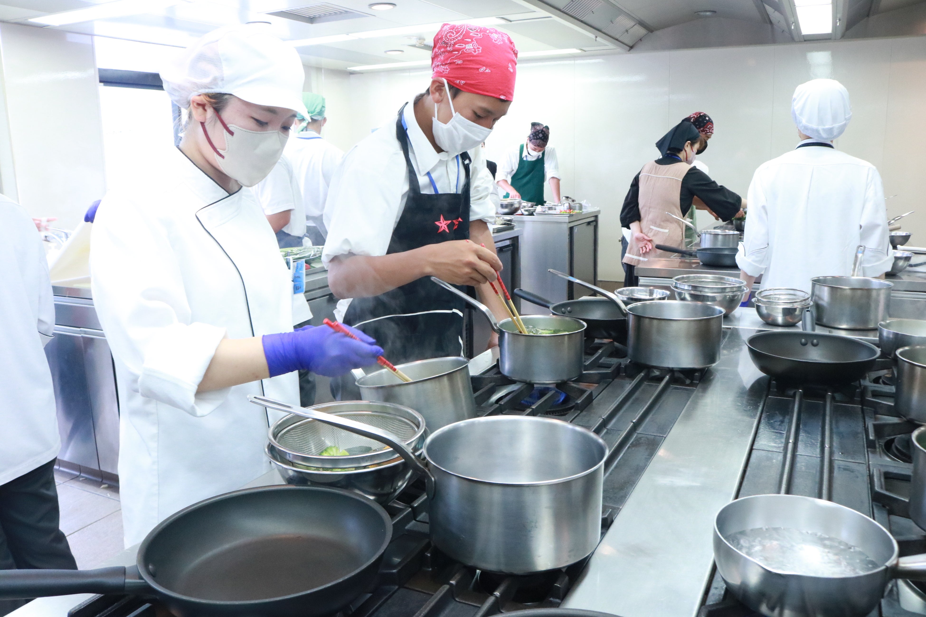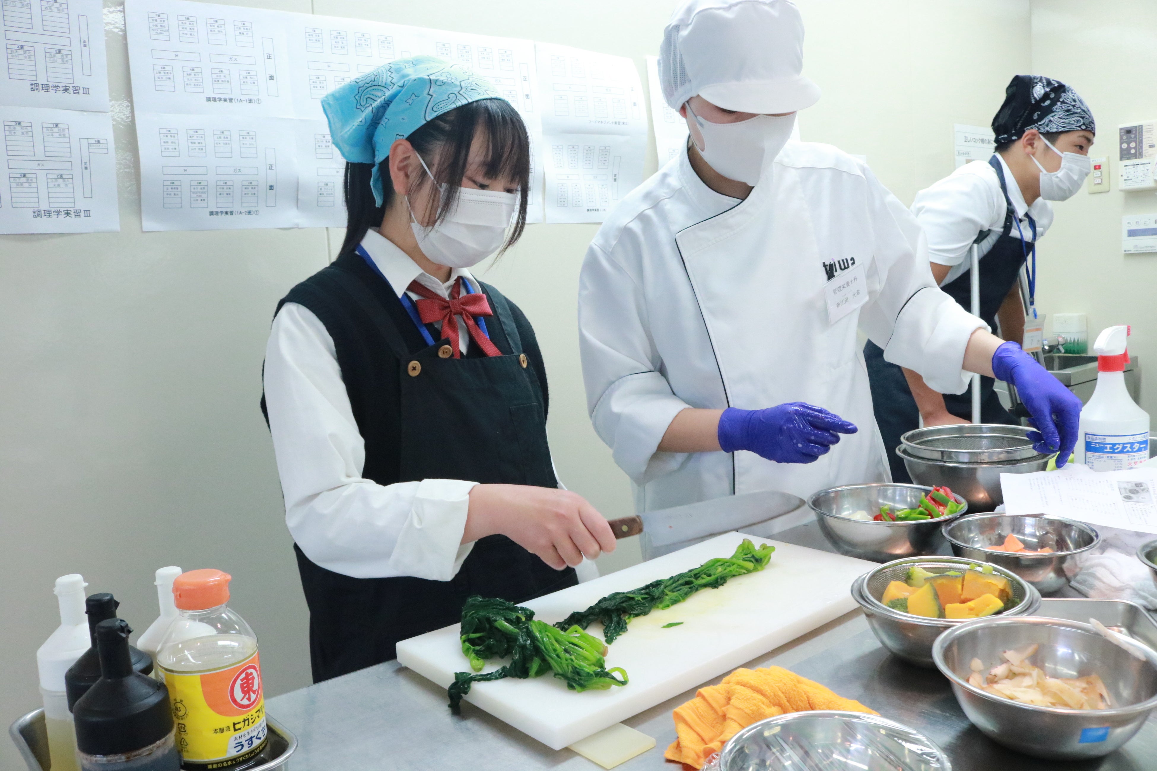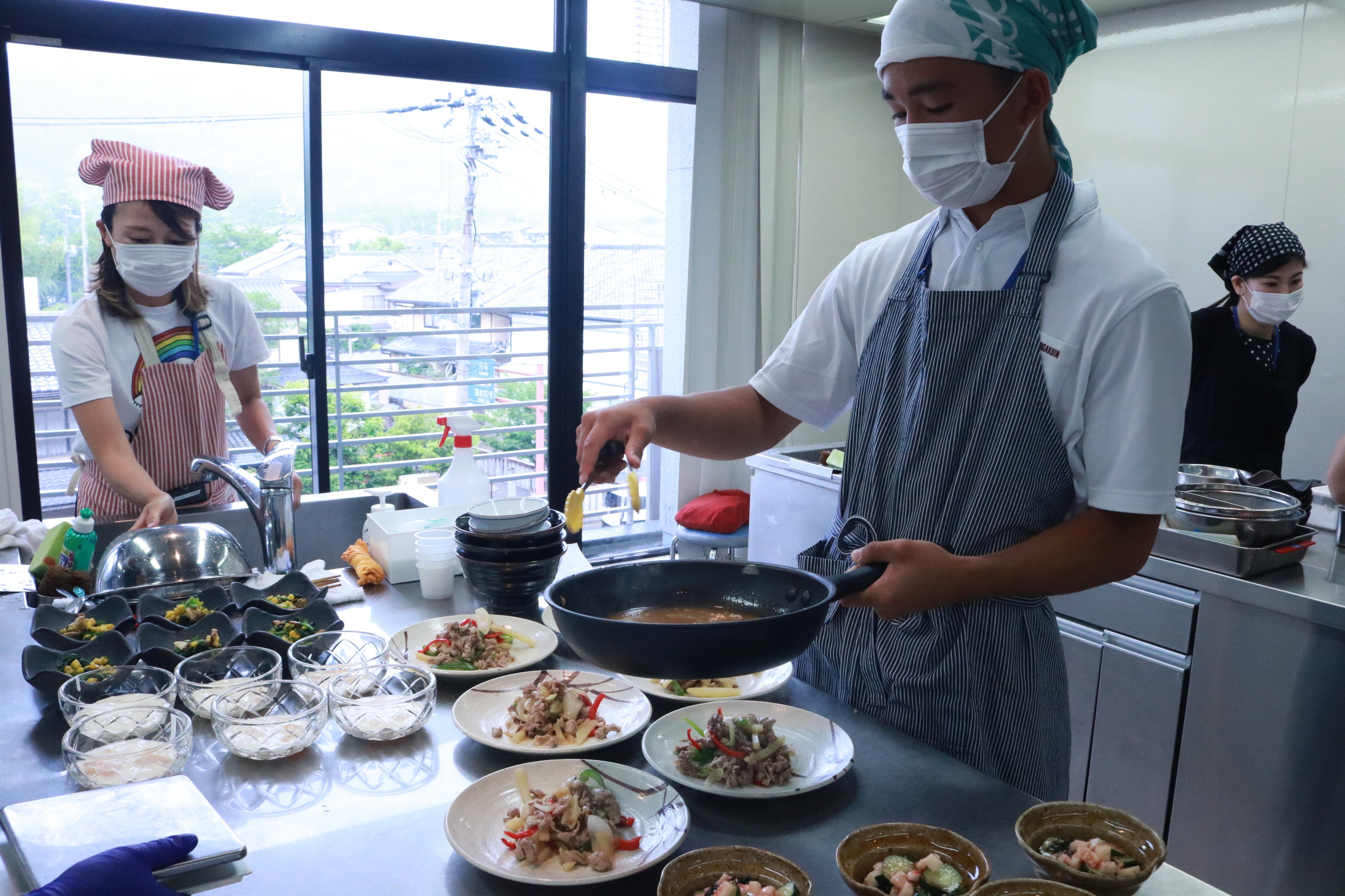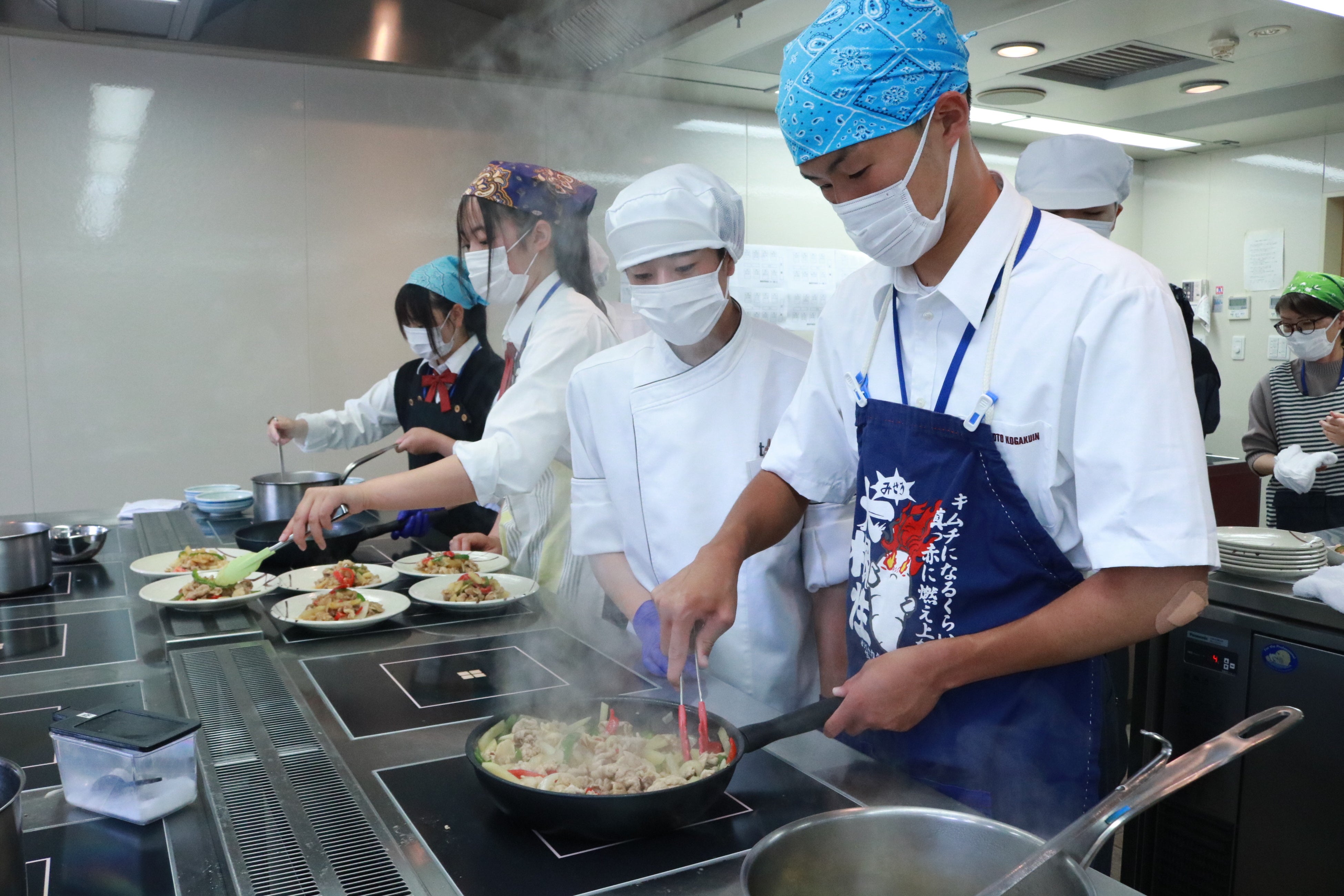 普段料理をしないという声も多数。本校の学生や教員に教わりながら、調理を体験しました。