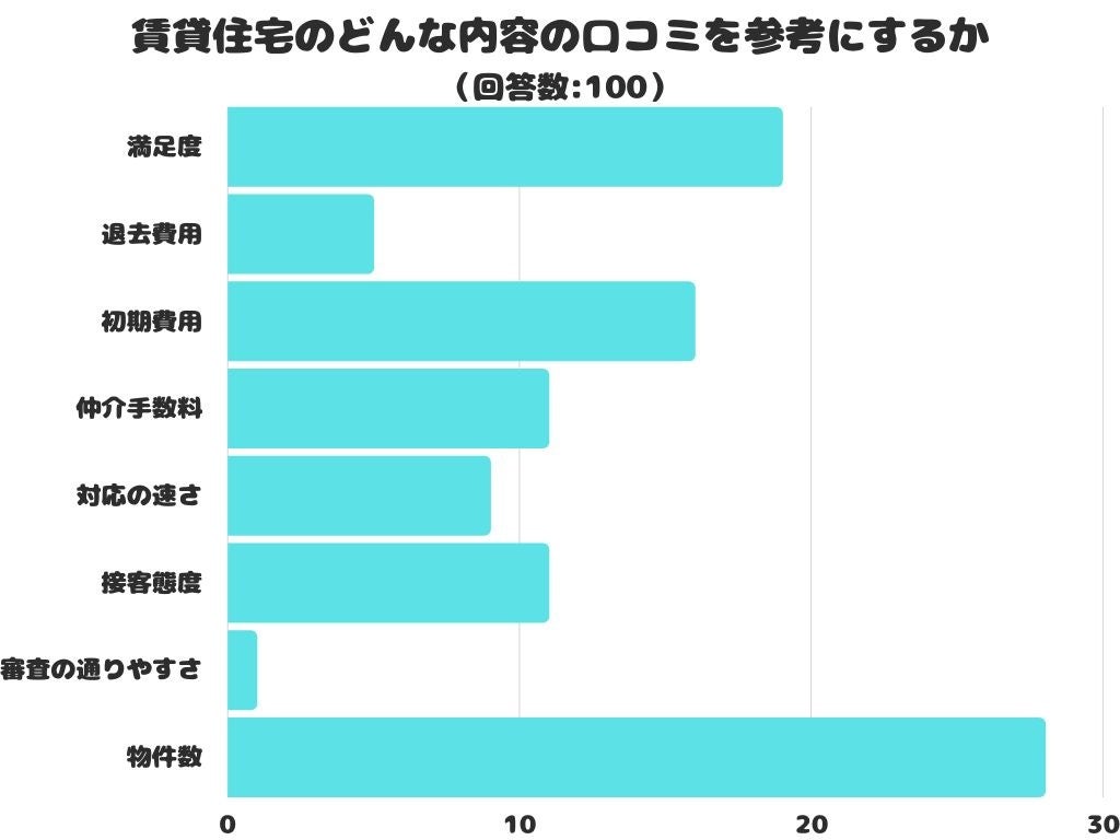 賃貸住宅のどんな内容の口コミを参考にするかをアンケートにて調査したところ、1位は「物件数」でした。