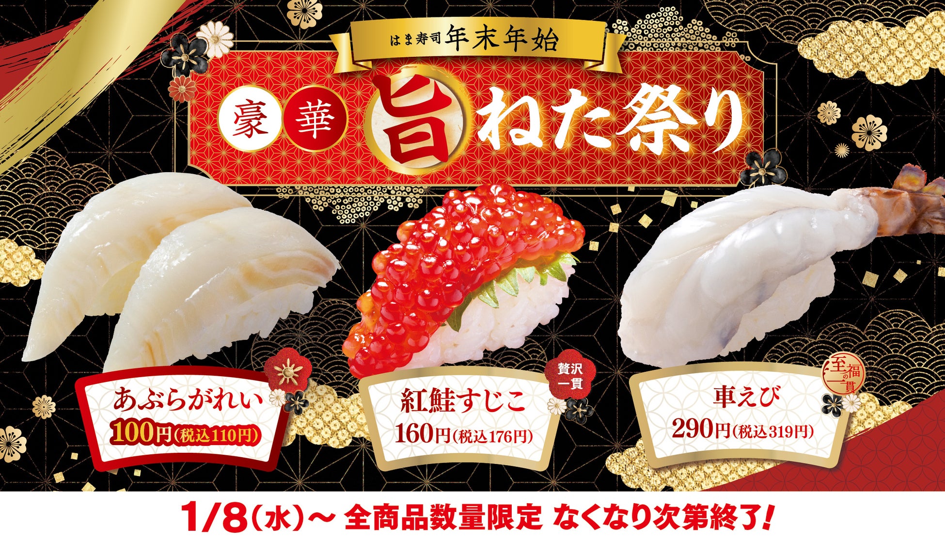 株式会社はま寿司(代表取締役社長:町野 岳 本社:東京都港区)が展開する100円寿司チェーン「はま寿司」は、1月8日(水)より「はま寿司 年末年始豪華旨ねた祭り 第2弾」を開催します。