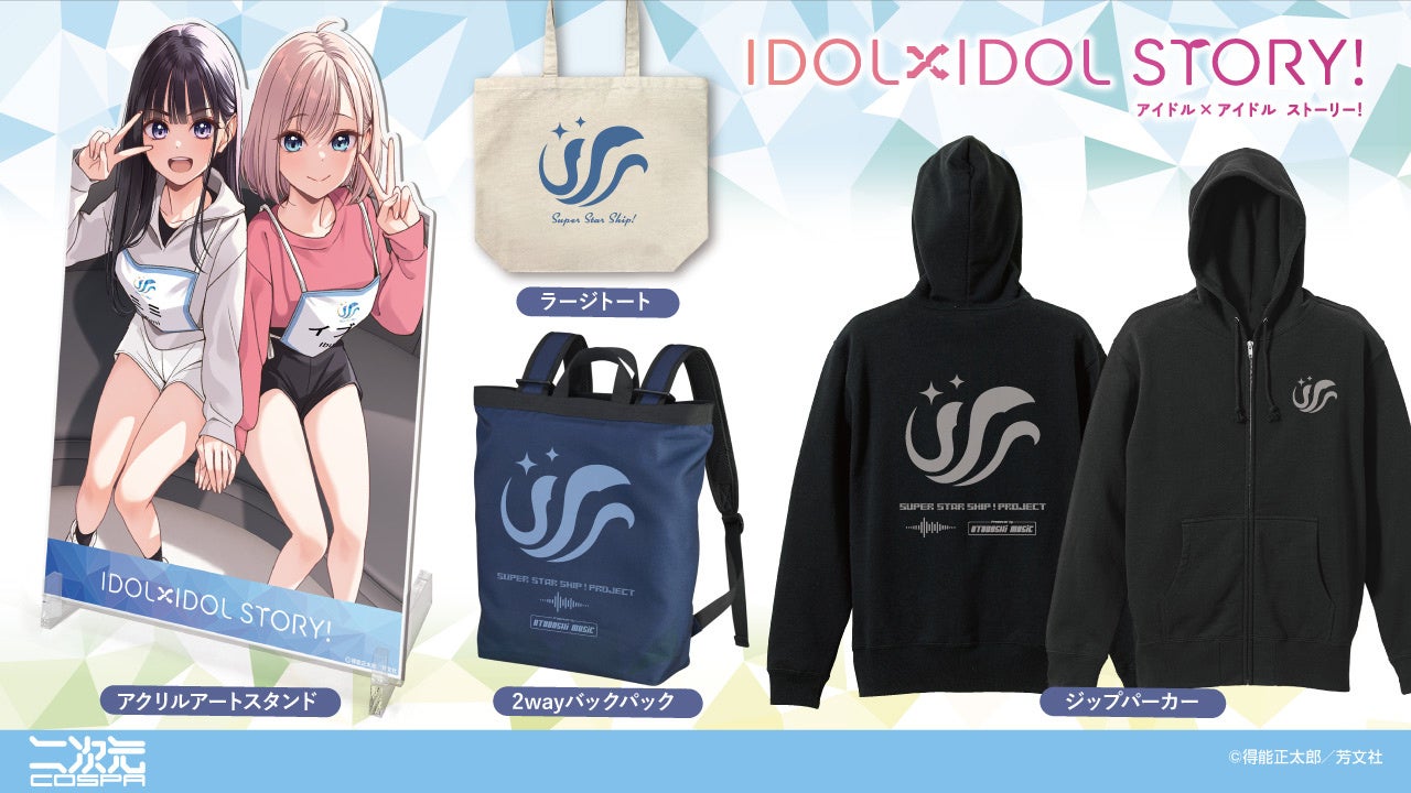 「ミミ&イブキ」のアクリルアートスタンドをはじめ、オーディション参加者への支給品をイメージした“スーパースターシップ”ロゴデザインのジップパーカー、ラージトートなどが二次元コスパから登場。