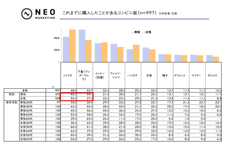 特に男女差が大きかったのが「ソックス」と「下着(アンダーウェア)」。前者は12.3ポイント、後者は17.5ポイントもの差が生じました。