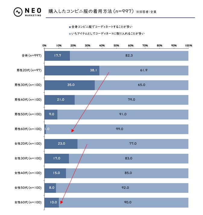 全体では、コンビニ服で全身コーディネートする割合は17.7%にとどまり、あくまでもアイテムとして取り入れるケースが主流であることがわかりました。