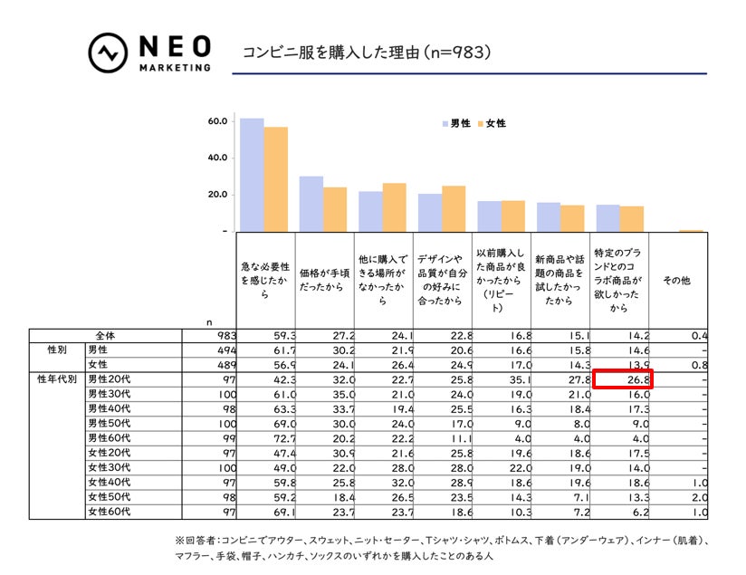 一方、前掲した設問【購入したコンビニ服のブランド】と同様、「特定のブランドとのコラボ商品が欲しかったから」と回答した割合が男性20代でトップに。やはり、コラボ服が来店動機になるケースは多いようです。