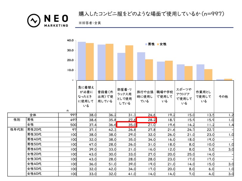 また、「部屋着・リラックス用として使用している」と回答した割合はほぼ全ての年代で女性の方が高く、反対に「旅行や出張時に使用している」と回答した割合は、全年代で男性の方が高くなっていました。