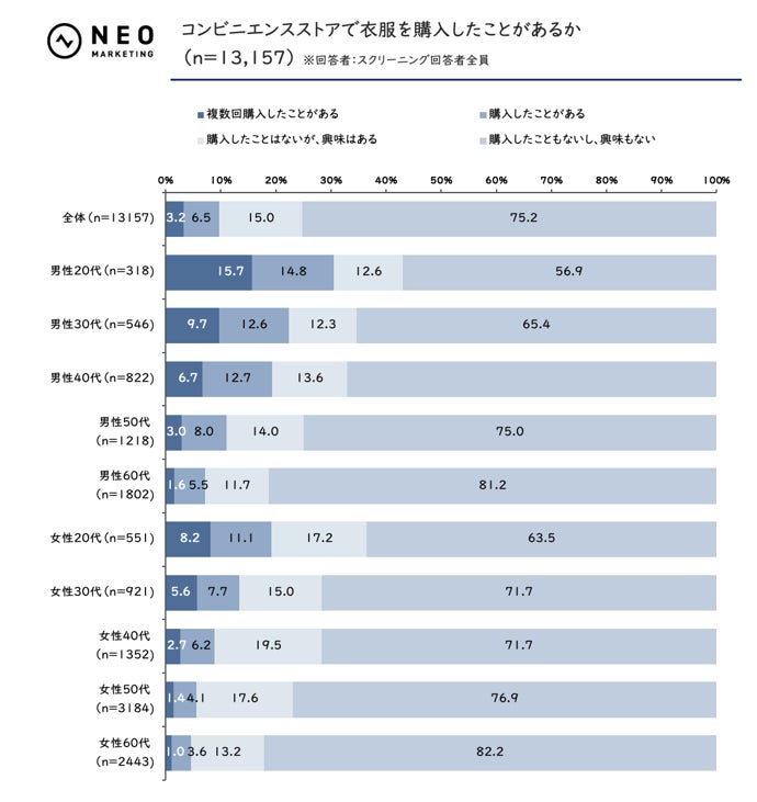 はじめに、スクリーニング調査として、コンビニエンスストアで衣服を購入したことがあるかお聞きしました。※以降、コンビニエンスストアで売っている衣服を「コンビニ服」と表記