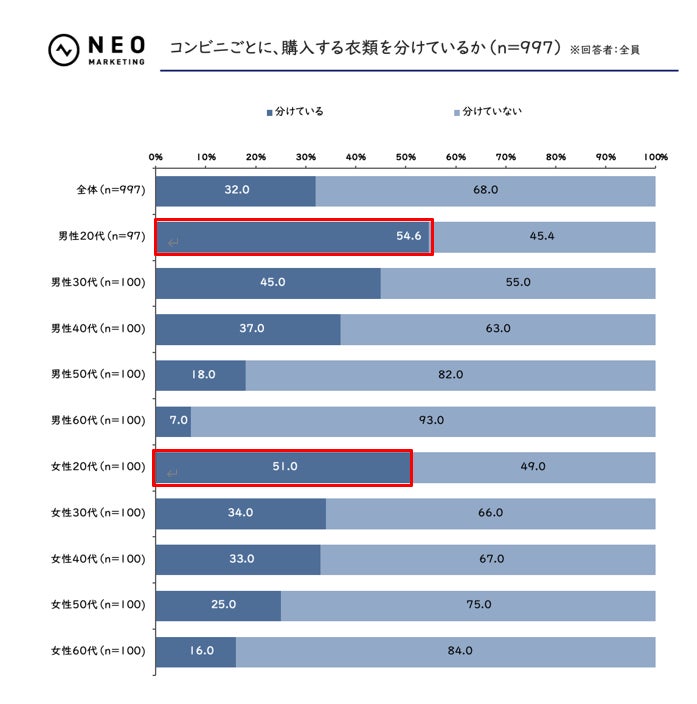 男性20代の54.6%・女性20代の51.0%が、コンビニごとに購入する服を分けている。