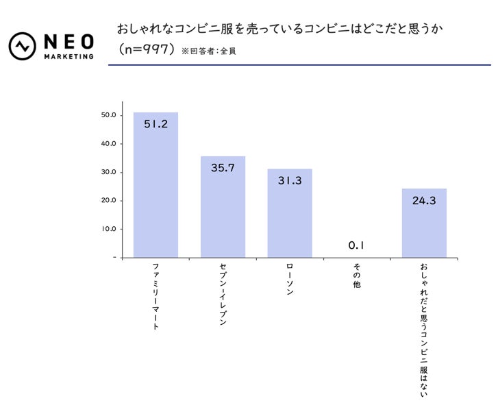 2021年より、ファッションデザイナー落合宏理氏との共同開発のもとオリジナル衣料品ブランドを展開する「ファミリーマート」が、51.2%でトップに。