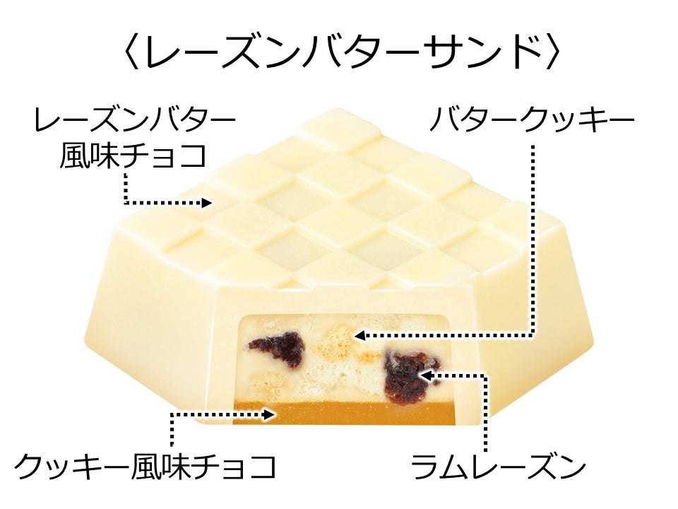 レーズンバター風味チョコで、バタークッキーとラムレーズンを包みました。