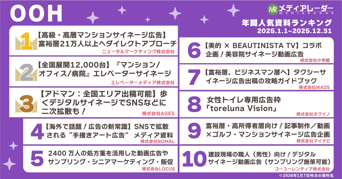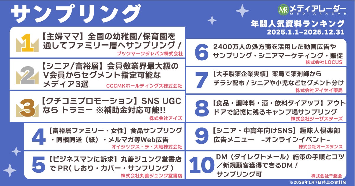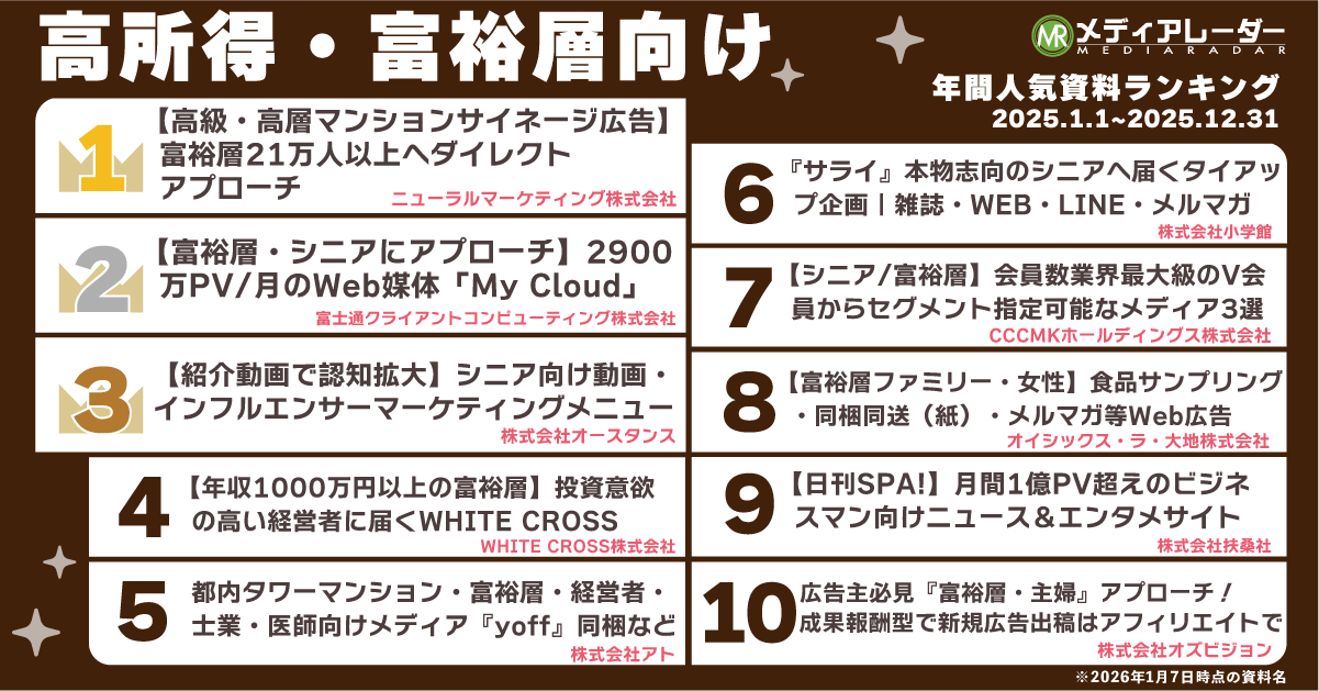 OOHの広告施策のほか、5位の「都内タワーマンション・富裕層・経営者・士業・医師向けメディア『yoff』同梱など/株式会社アト」や、8位の「【富裕層ファミリー・女性】食品サンプリング・同梱同送(紙)・メルマガ等Web広告/ オイシックス・ラ・大地株式会社」など、“ダイレクトに届けられる”サンプリング施策に関する資料もランクインしました。