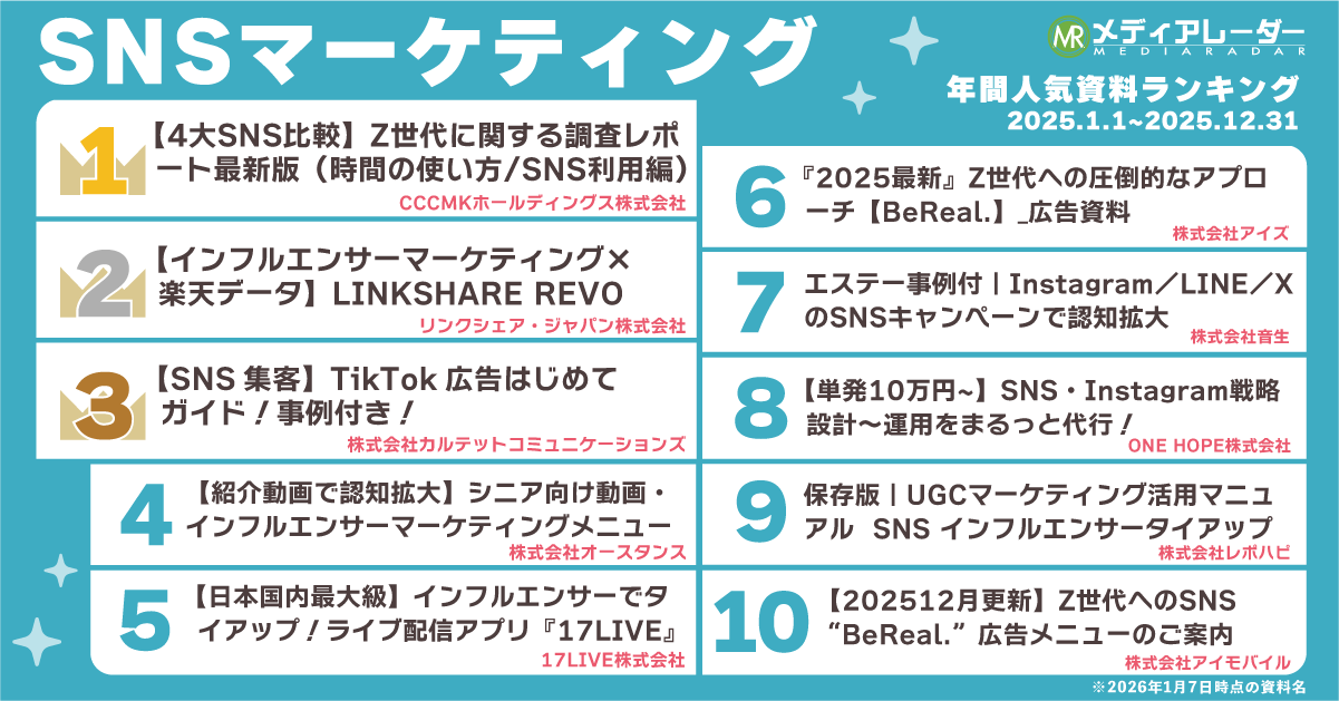 2024年年間人気資料ランキングの同部門と比較すると、6位の「 『2025最新』Z世代への圧倒的なアプローチ【BeReal.】_広告資料/株式会社アイズ」や10位の「 【202512月更新】Z世代へのSNS“BeReal.”広告メニューのご案内/株式会社アイモバイル」など、SNSの中でも「BeReal.」に関連した資料が初めてランクインする結果となりました。
