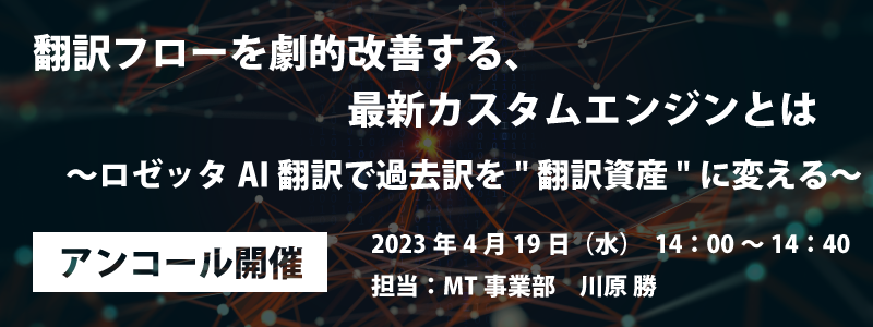 AI自動翻訳のロゼッタ ウェビナー『翻訳フローを劇的改善する、最新カスタムエンジンとは ~ロゼッタAI翻訳で過去訳を"翻訳資産"に変える~』4月19日(水)開催