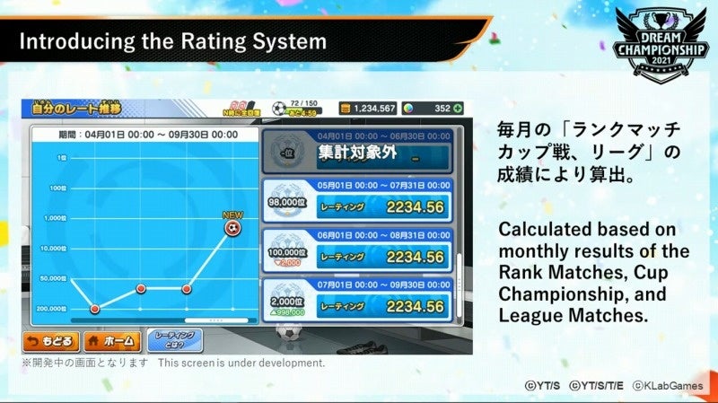 「レーティングシステム」では、毎月のランクマッチ、カップ戦、リーグの成績によりレーティングが算出(※)され、最終的な上位ランカーには「Dream Championship 2022」の参加権が付与される予定です。
