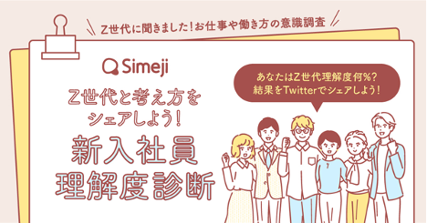 Simejiでは、 Z世代の新入社員の考え方を他の世代に知ってもらうことでコミュニケーションのきっかけにすべく、webコンテンツ「新入社員理解度診断」 もご用意しています。ぜひみなさん、Z世代のことをどれくらい理解しているか、診断に挑戦してみてください。