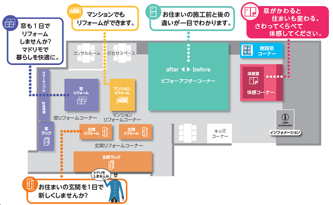 今回のリニューアルは、『窓とドアのリフォームをわかりやすく知ってもらう』をコンセプトに、空間展示「ビフォーアフターコーナー」を新設しました。これは、LDK・浴室・玄関周りの3つの空間をまるごとリフォームし、施工の前と後を見比べられるように配置することで、リフォーム後の生活をイメージしやすくし具体的な商品選定を提案します。また、「マンションリフォーム」の専用コーナーを新たに設け、戸別にリフォームできる商品をまとめて紹介します。さらに、窓リフォームがもたらす断熱や防音、節電などのさまざまな効果や、3 省(国土交通省・経済産業省・環境省)連携による住宅の省エネ化を促進する補助事業「住宅省エネキャンペーン2023」の対象商品を展示する「窓リフォームコーナー」も新設しました。