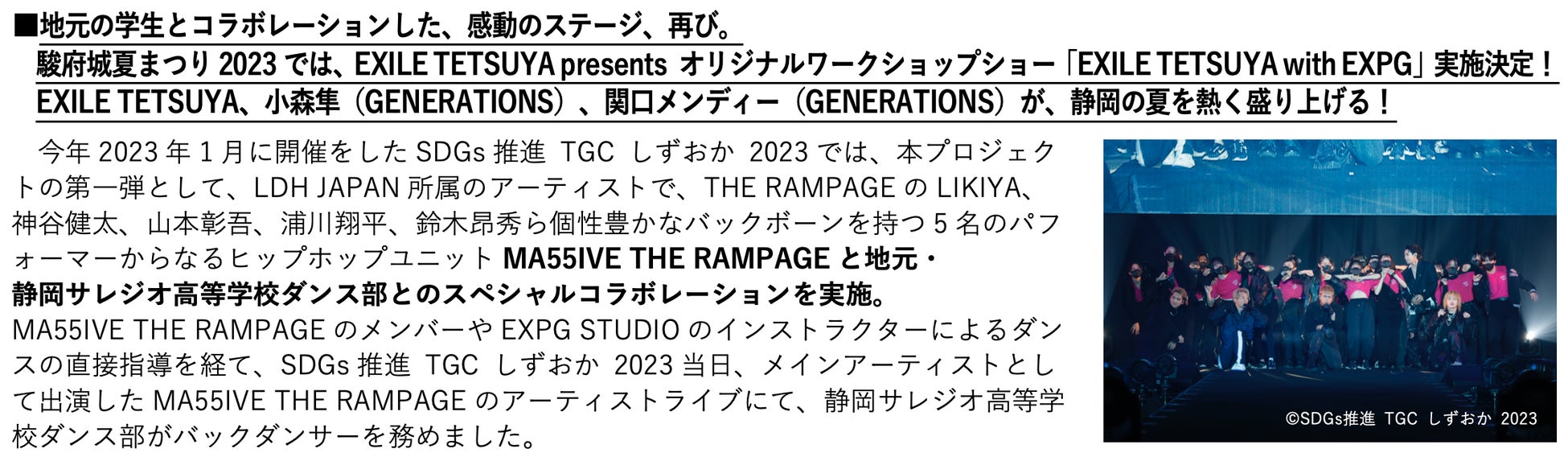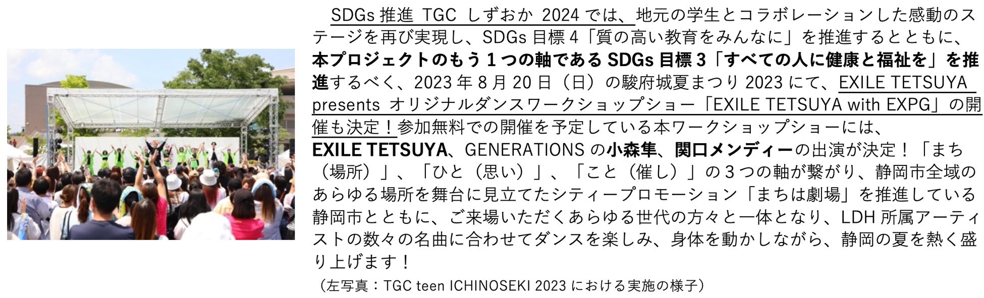 W TOKYOは、TGCを活用した地方創生とともに、変わり続ける社会課題と青年層をつなぐ架け橋として、2015年国連総会でのSDGs採択以降、長きに渡り、SDGsの推進活動に多角的に取り組んでまいりました。その取り組みの一環として、日本を代表するエンターテインメントカンパニーで、様々な社会貢献を実施されているLDH JAPAN様とパートナーシップを組ませていただき、地方創生プロジェクト(※)を今年よりスタートしました。今年1⽉に開催した「TGCしずおか」では、本プロジェクトの第⼀弾として、MA55IVE THE RAMPAGE様と静岡サレジオ⾼等学校ダンス部様とのスペシャルコラボレーションを実施。憧れのアーティストとの共演に、学生たちが涙して感動する様子を目の当たりにし、このプロジェクトの重要性を再確認しました。また、静岡はSDGs未来都市に選定されていることもあり、様々なSDGsの取り組みを行われてきました。今回もLDH JAPAN様とのプロジェクトの一環として、静岡市様のご協力を得ながら、地元の学生とコラボレーションした感動のステージを再び実現し、SDGs目標4「質の高い教育をみんなに」を推進するとともに、本プロジェクトのもう一つの軸であるSDGs目標3「すべての人に健康と福祉を」を推進するべく、2023年8月20日(日)の駿府城夏まつり2023にて、オリジナルダンスワークショップショー「EXILE TETSUYA with EXPG」の実施を予定しております。当日は、現地の皆様、観光客の皆様に向けて、ダンスを通じた健康促進を行っていきますので、どうぞよろしくお願いします。