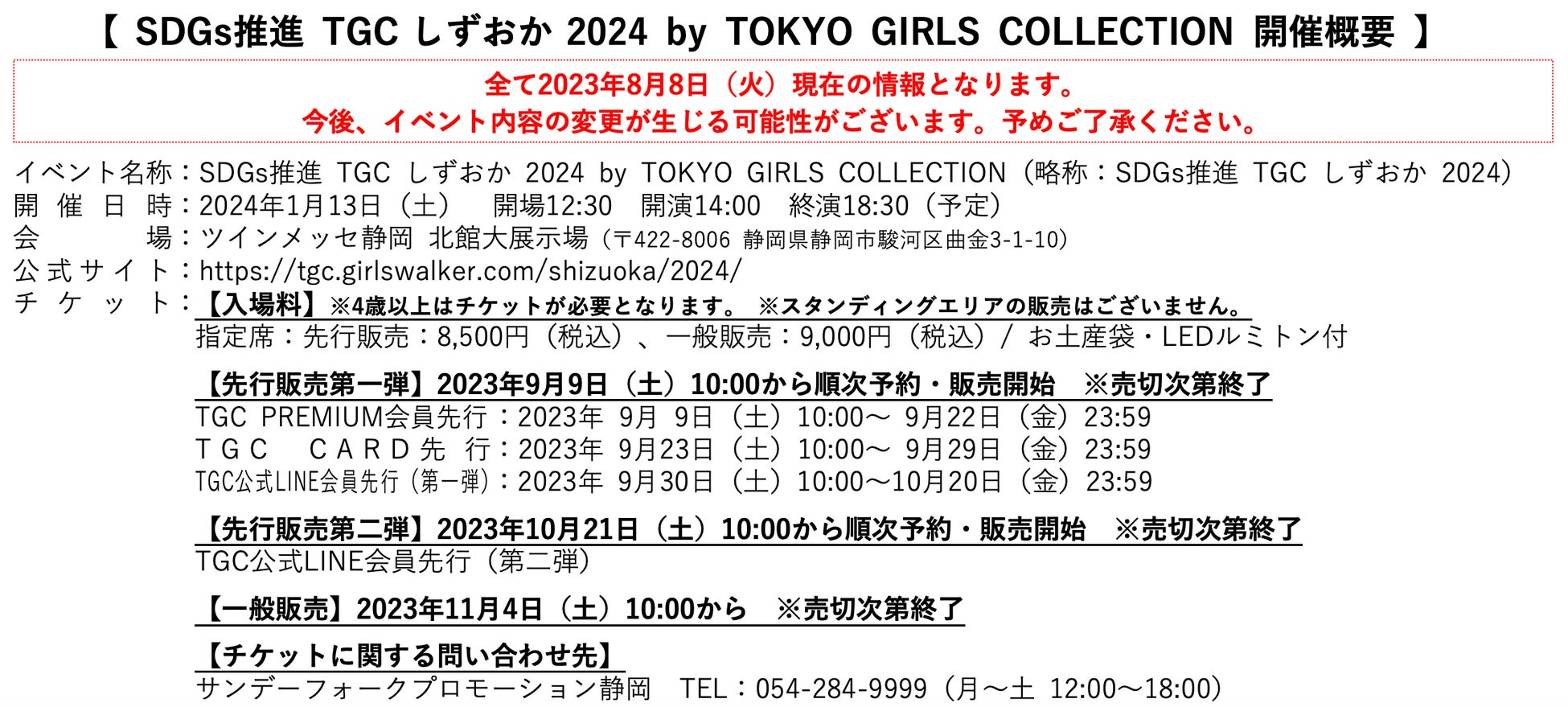 ゲストモデル:嵐莉菜、アリアナさくら、池田美優、景井ひな、鈴木ゆうか、なえなの、菜波、新沼凛空、村瀬紗英 他 ※50音順 ステージ内容:ファッションショー、アーティストライブ、パートナーステージ、パートナーブース 他 主催:東京ガールズコレクション実行委員会 共催:静岡県、静岡市 後援:国連の友Asia-Pacific プラチナパートナー:株式会社シャンソン化粧品 公式メディア:girlswalker 演出:DRUMCAN 企画/制作:株式会社W TOKYO |