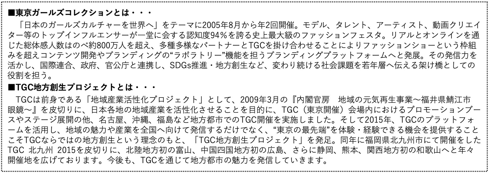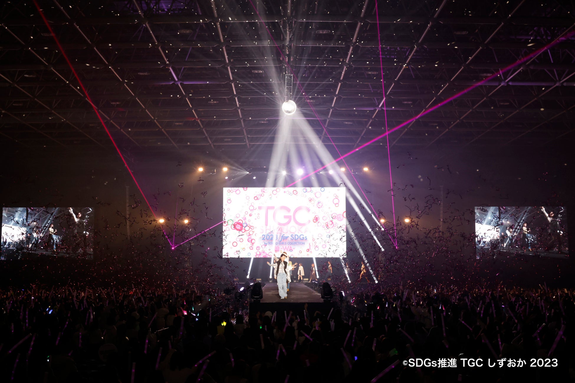 東京ガールズコレクション実行委員会では、2015年にSDGsが採択されて以降、TGCの発信力・拡散力を活用し、主に若年層に向けてSDGs推進の重要性を普及してまいりました。中でも“TGC地方創生プロジェクト”の新たなカタチとして、TGCの地方開催の中では唯一、イベント名称に“SDGs推進”と掲げて開催をしている「TGCしずおか」では、2019年の初開催より、開催を通して“SDGsを推進する”最先端の様々な施策を展開。今年2023年1月に開催をした「SDGs推進 TGC しずおか 2023」では、TGCを象徴する全ファッションショーにSDGs達成に向けた目標を設定。地球に優しく、サステナブルでエシカルなアイテムをコーディネートに多数採用し、未来につながる持続可能なニューノーマルファッションを提案したショーの展開をはじめ、『大河ドラマ「どうする家康」(NHK)』と静岡市とのコラボレーションステージでは、ドラマの舞台となった静岡市の魅力を発信、さらに「花の都」とも呼ばれる静岡県産の生花や、世界から高い評価を得る遠州織物など、歴史ある伝統文化や工芸品も発信し、総体感人数のべ約1,431,940名、経済効果は約23億3,048万円を記録。大盛況のうちに幕を閉じました。