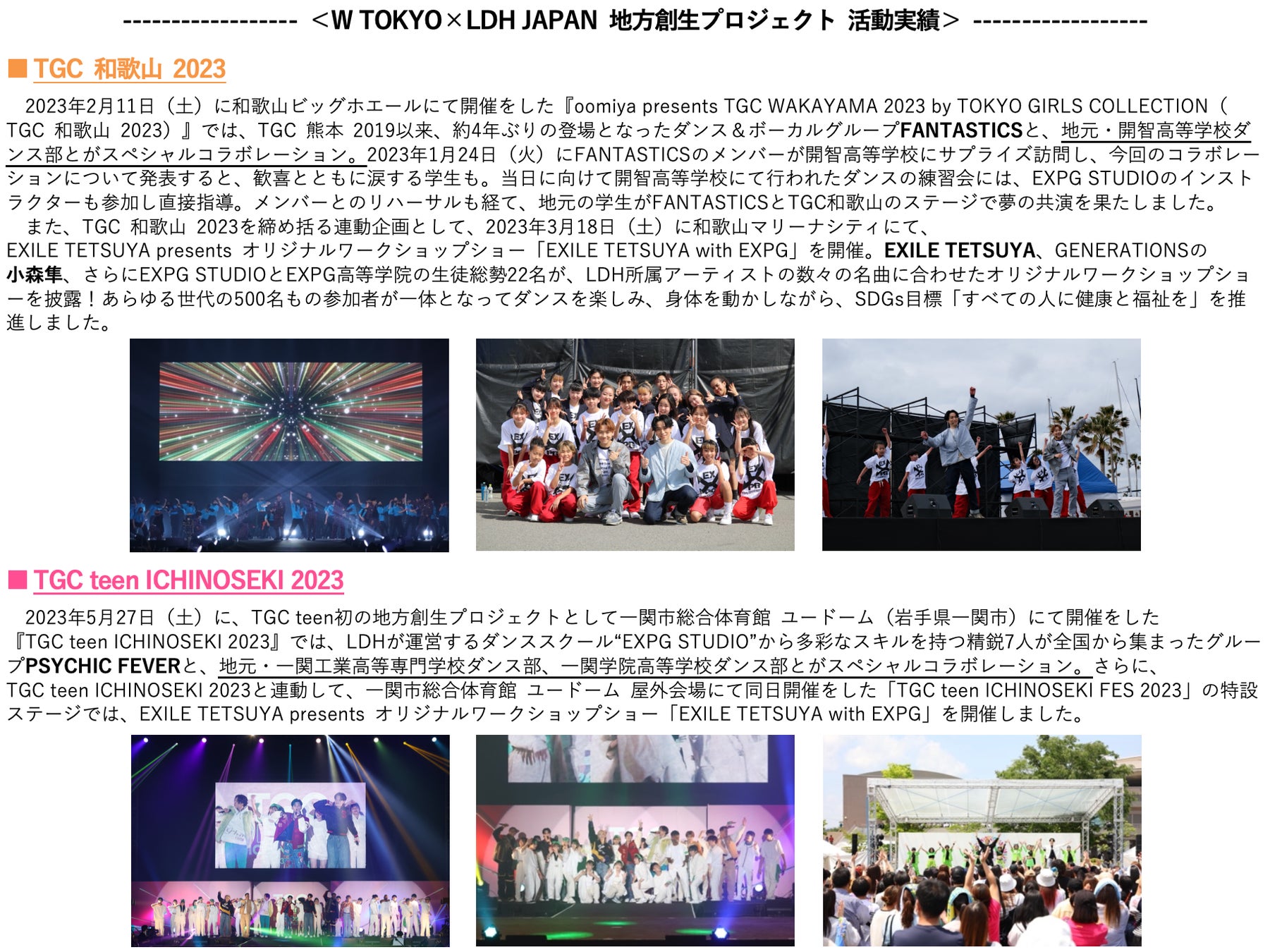 (※)<W TOKYO×LDH JAPAN 地方創生プロジェクトとは> 株式会社W TOKYOと株式会社LDH JAPANが2022年11月にパートナーシップを組み、全国各地で開催されるTGCの場を活用し、ダンスをはじめとするエンタテインメントと自治体とのコラボレーションを通じた地域社会への貢献、SDGsの推進を目指す新たなプロジェクト。主に、SDGs目標3「すべての人に健康と福祉を」を推進する老若男女幅広くダンスに触れ合える機会の創出、SDGs目標4「質の高い教育をみんなに」を推進するダンスを通じた次世代育成とエンタテインメント体験機会の創出、SDGs目標17「パートナーシップで目標を達成しよう」を推進する自治体・W TOKYO・LDH JAPANみんなで協力していく、という3つの軸で活動しています。 |