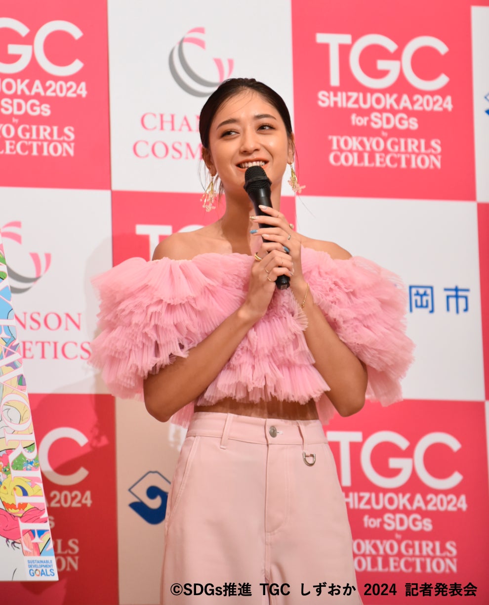 記者発表会には、TGCを代表して静岡生まれの池田美優が、TGCしずおかのテーマカラーでもある華やかなピンクの衣装で「ただいま〜!」と登場!「TGCはコンテンツが盛り沢山で、SGDsもそうですけど、リメイクした衣装でランウェイを歩く、ファッションショーならではの取り組みや、会場内にお客様の古着を回収するボックスを設置したり、最先端を行っているなという印象です。私もSDGsを聞いたことあるなというくらいの段階で2019年にTGCしずおかが初開催されて、その時にはっきりとSDGsを認識したので。TGCというと、私も力を入れて、普段と違う形で挑んでいるのですが、そのくらいTGCって楽しいですし、有難い場所だなって思います。」とTGCの魅力を紹介。2019年の初開催から4開催連続での出演となるTGCしずおかについて「静岡での開催をまだかまだかと待っていたので、初開催された時はすごく嬉しかったですし、静岡にいる友達も喜んでくれて、地元でこんな大きなイベントをやってくれるんだって。それを身に染みて感じたので、やっぱりTGCしずおかは私の中で特別なTGCだなと思います。」と、想いを語り、今年の「TGCしずおか」で着用した、静岡県の薔薇を使った衣装の重さが30キロもあったことを明かし「歩いていてもいい香りがして、癒されながら歩いたのが印象的でした。ただ、本当に大変でした!(笑)でも、あのドレスを着て出た瞬間にみんなが眼差しをくれて、綺麗!と声も聞こえたので、頑張ってよかったなと思いましたし、静岡ってこんなに素敵なお花があるんだよということも伝えられて嬉しかったんですけど、終わった後は開放感と達成感でいっぱいでした。来年も覚悟しておきます(笑)」と、思い出をトーク。