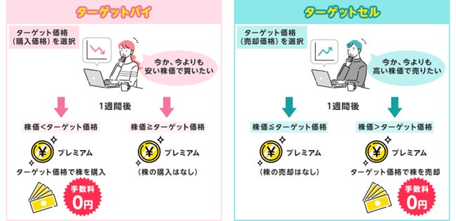 本サービスでは、対象銘柄の株価(時価)が判定時にターゲット価格に到達していた場合に、当該ターゲット価格で当社との間で対象銘柄の売買が行われます。「ターゲットバイ」においてはターゲット価格と株価(時価)との差額が含み損(評価損)になり、「ターゲットセル」においては株価(時価)がターゲット価格を上回った分の値上がり益を放棄することになりますが、いずれの場合でも現金(プレミアム)を確実に受け取りつつ、狙った価格かつ手数料ゼロで国内株式の売買ができます。対象銘柄の株価(時価)が判定時にターゲット価格に到達していなかった場合には、国内株式の売買は行われず、現金(プレミアム)を受け取ることで取引が終了します。本サービスの提供により、個人投資家の皆さまの資産形成の幅を広げることができるものと期待しています。当社は、今後も「業界最低水準の手数料で業界最高水準のサービス」を提供するべく、魅力ある商品の提供・サービスの拡充を行い、お客さまの資産形成を支援していきます。