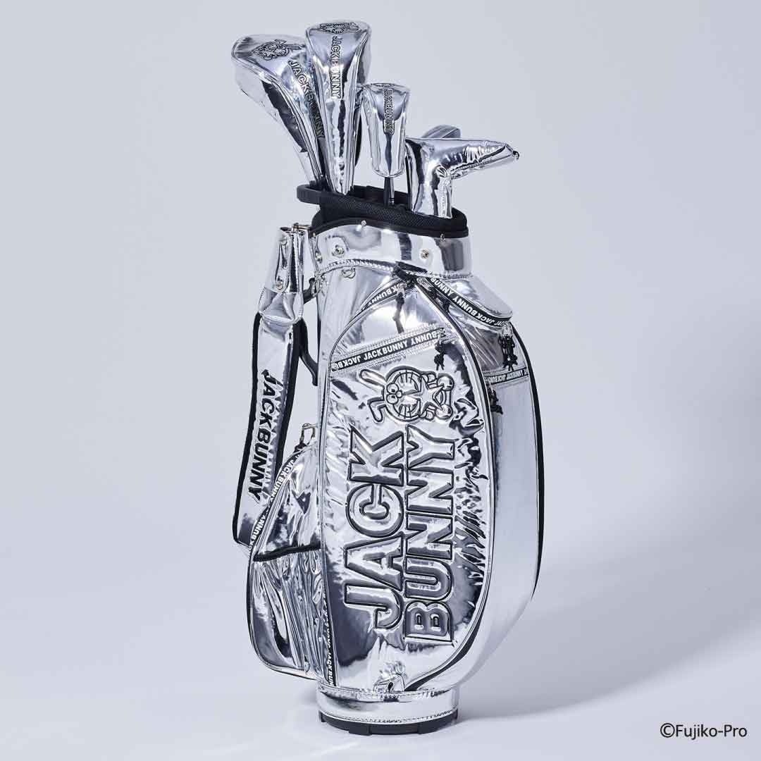 2023年はひと際目を引くシルバーのキャディバッグとセットで使用できるヘッドカバーをご用意しました。フロントには星を持ったドラえもんとロゴが配されたデザインになっています。自立タイプで展開。