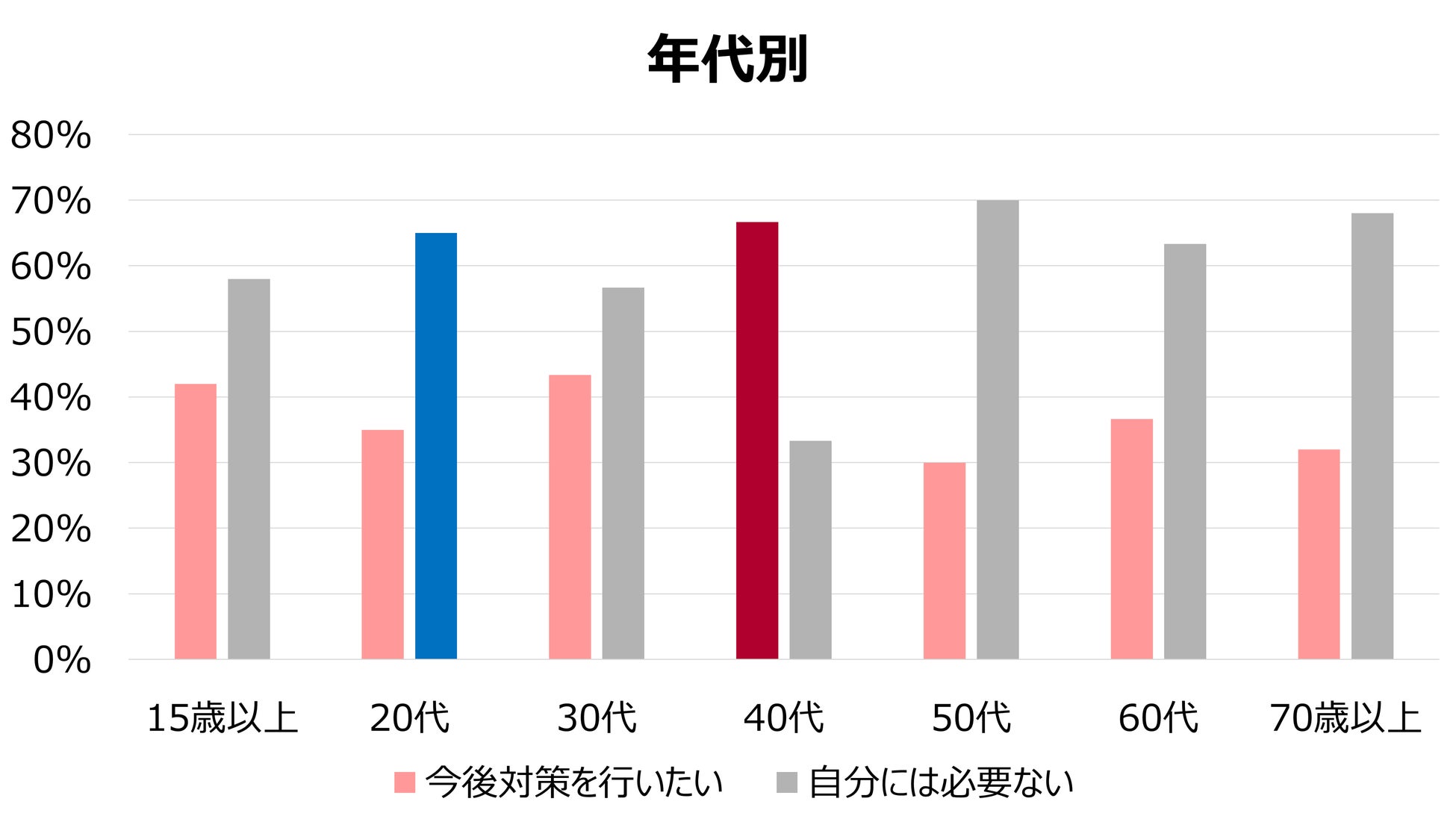 一方で20代は「対策したい」と回答した人が35%と少なく、多くの人が自身には対策の必要が無いと考えていることがわかりました。