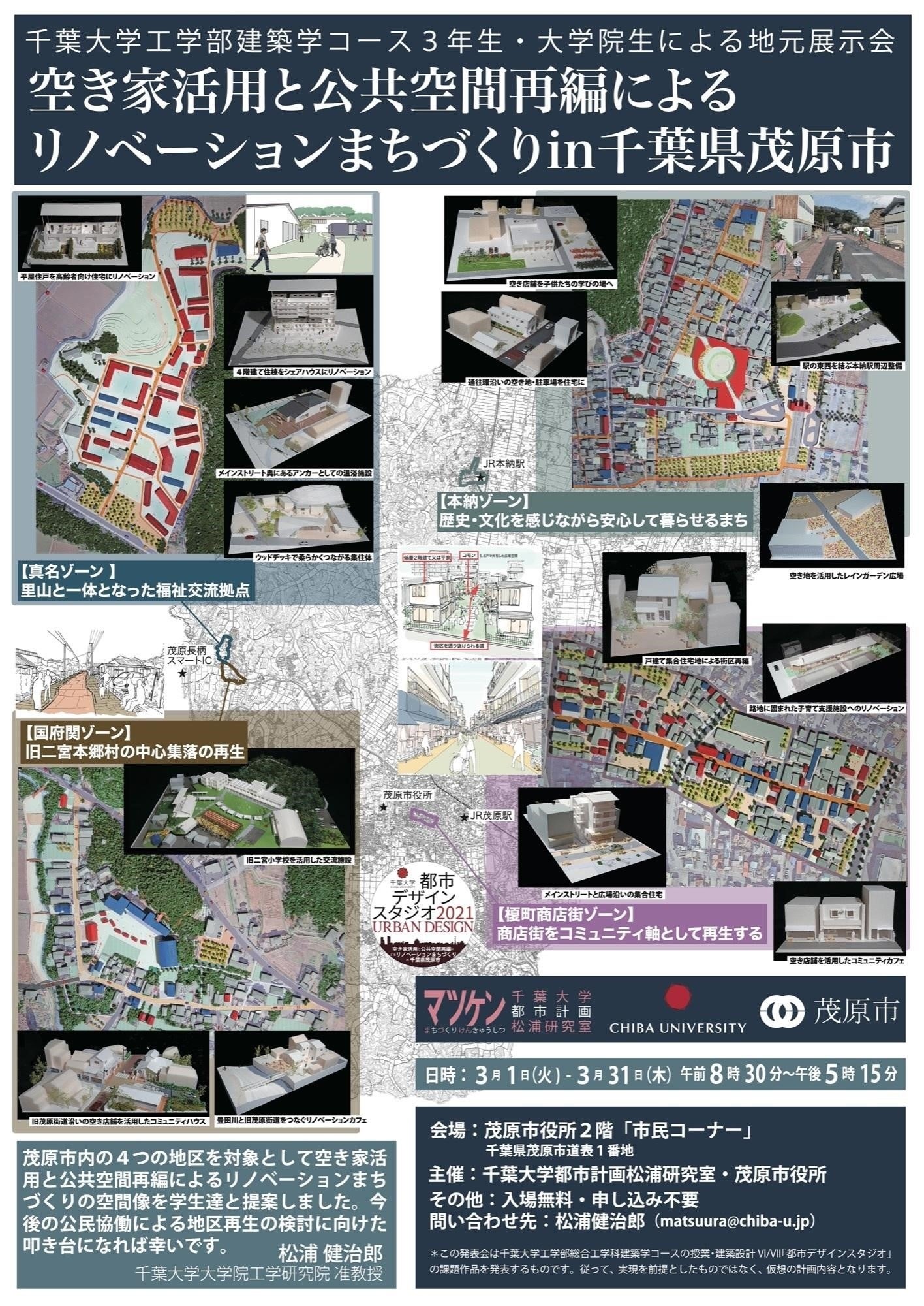 千葉大学工学部総合工学科建築学コースおよび大学院融合理工学府創成工学専攻建築学コースは、コースで開講している授業内で3年生・大学院生が設計した課題作品を展示する地元展示会「空き家活用と公共空間再編によるリノベーションまちづくりin千葉県茂原市」を開催します。