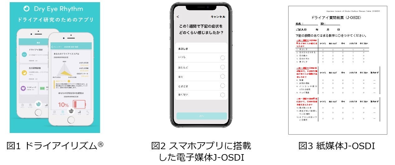 本研究では、当研究グループが開発したドライアイ研究用スマホアプリ「ドライアイリズム®」 (図1) を用いて、スマホアプリに搭載した電子媒体のドライアイ疾患特異的質問紙票 (日本語版OSDI, J-OSDI(※2)) (図2)と紙媒体のJ-OSDI (図3) によって収集されたドライアイ自覚症状に関する症状スコアであるJ-OSDI合計スコアの同等性を検証しました。
