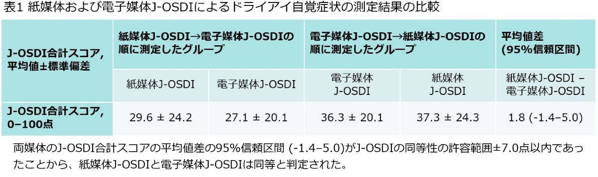 研究参加者33名から得られたデータを解析したところ、紙媒体J-OSDIおよび電子媒体J-OSDIによって得られたJ-OSDI合計スコアの平均値の差は1.8点 (95%信頼区間: -1.4–5.0) であり、J-OSDIの同等性の許容範囲内であったことから、紙媒体J-OSDIと電子媒体J-OSDIは同等と判定されました (表1)。