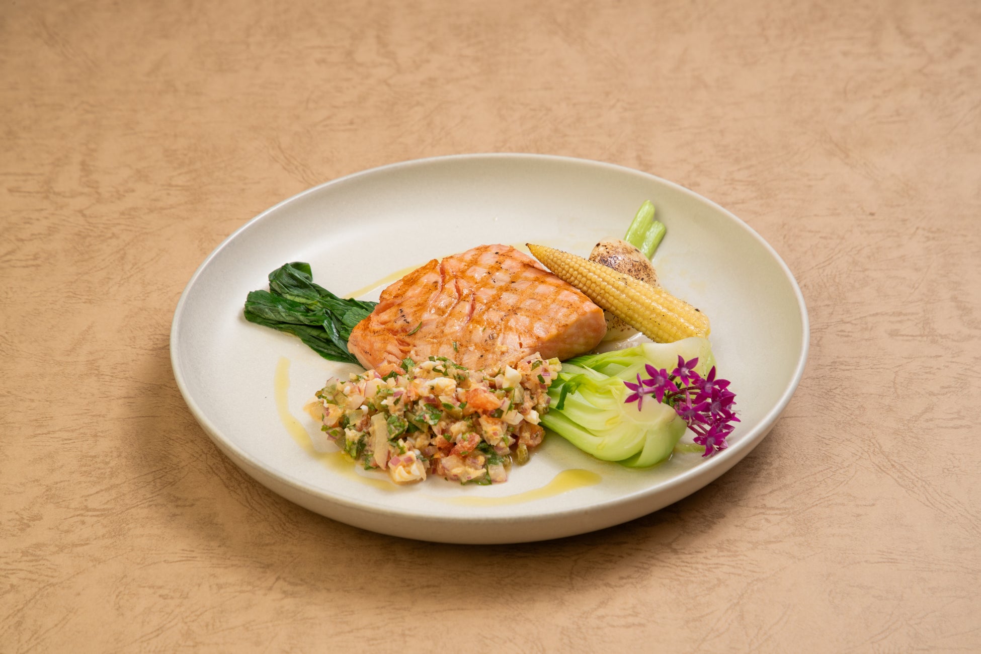 脂の乗ったサーモンをグリルし、余分な脂を落としつつ美味しさを保ちました。食べる野菜のタルタルでさっぱりと!