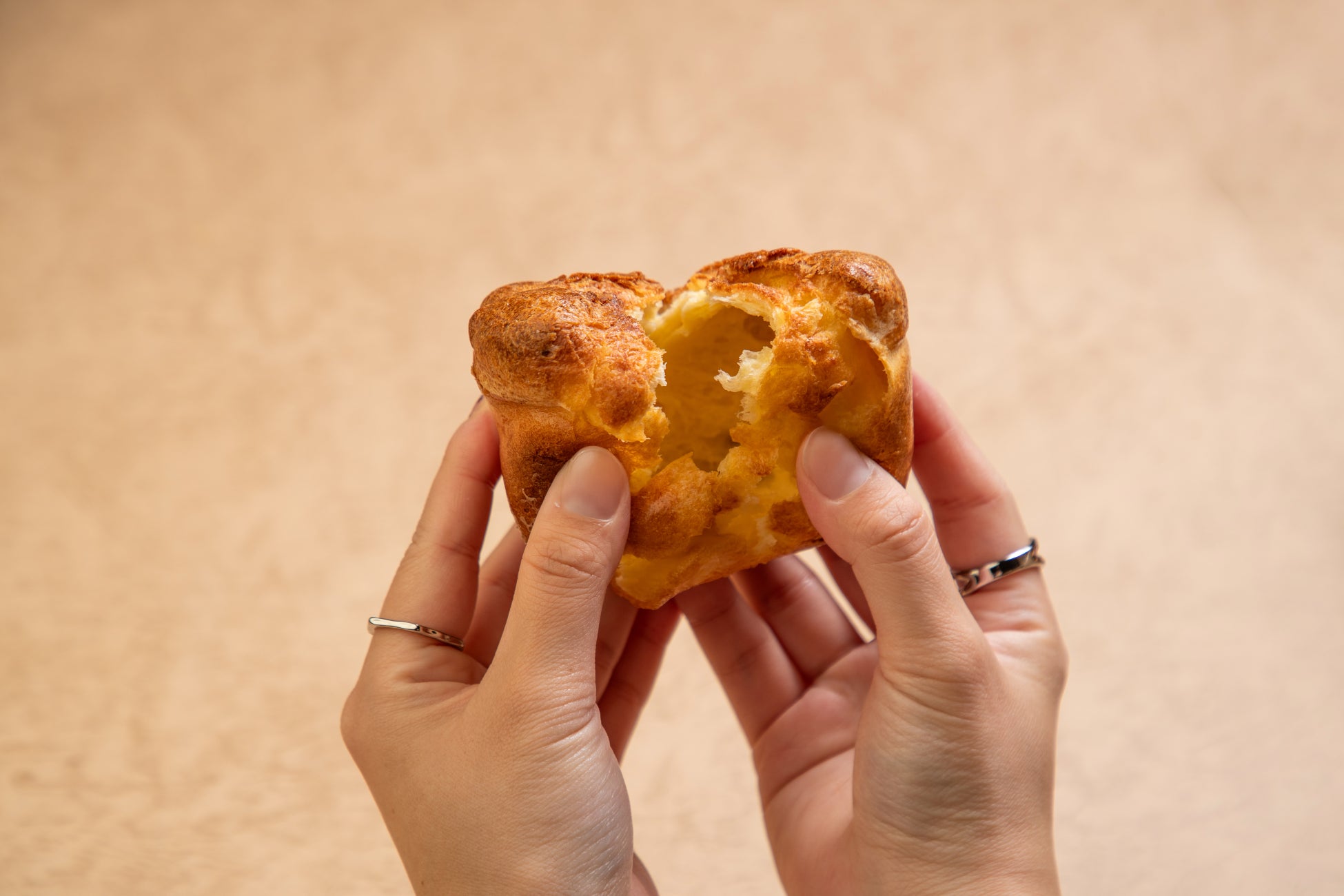 見た目は丸いシュー生地に似ており、外側はパリッと香ばしく、内側は空洞ができていて、もちもち・しっとりとした食感が特徴です。