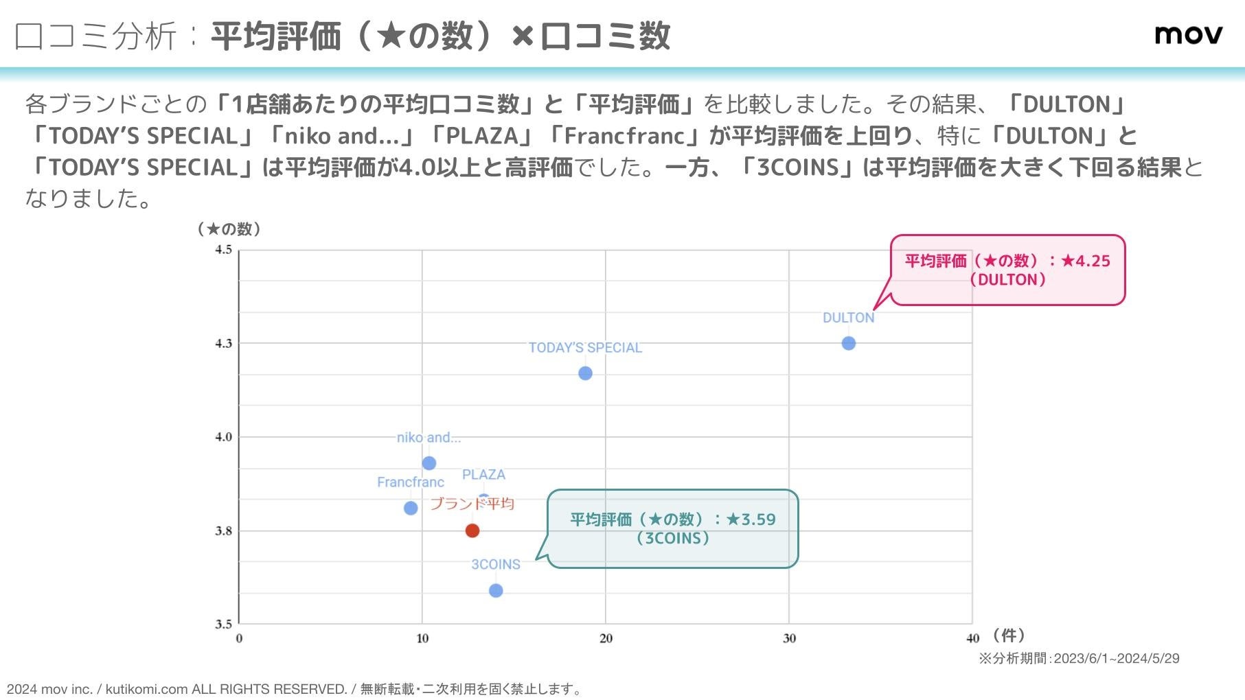 その結果、「DULTON 」「TODAY’S SPECIAL」「niko and...」「PLAZA」「Francfranc」が平均評価を上回り、特に「DULTON」と「TODAY’S SPECIAL」は平均評価が4.0以上と高評価でした。一方、「3COINS」は平均評価を大きく下回る結果となりました。