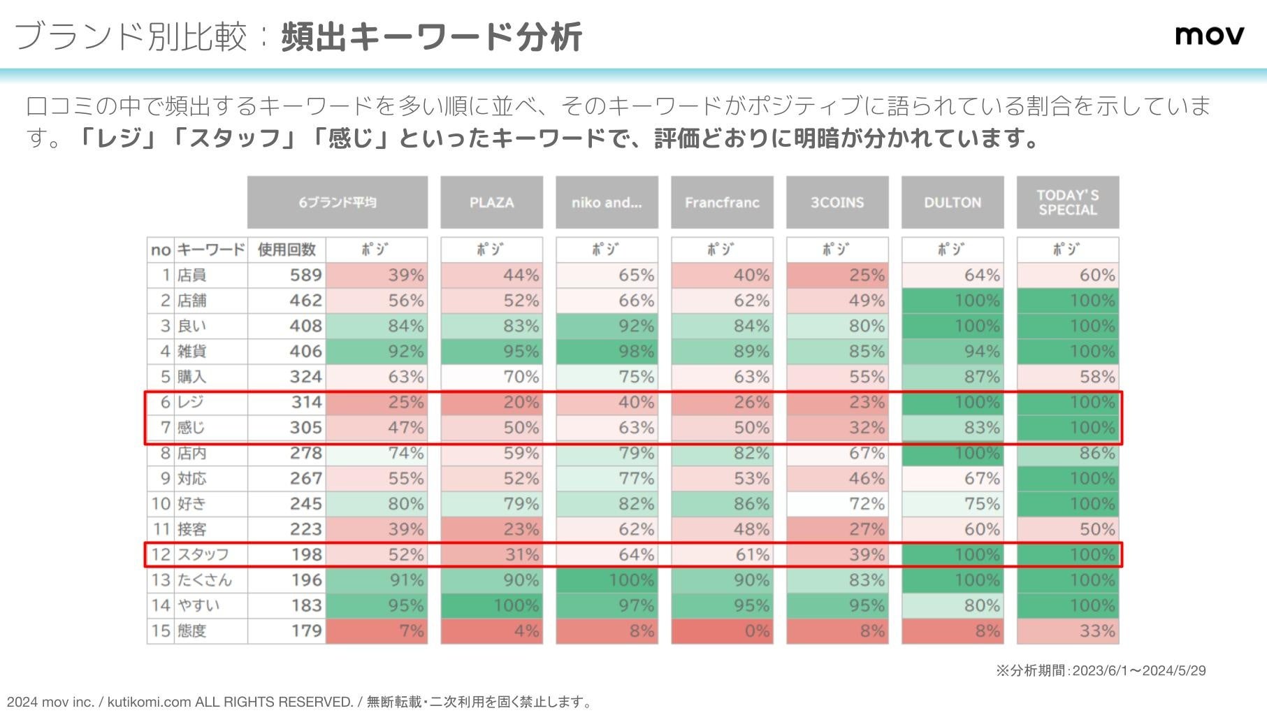 上の表は口コミの中で頻出するキーワードを多い順に並べ、そのキーワードがポジティブに語られている割合を示しています。「レジ」「スタッフ」「感じ」といったキーワードで、評価どおりに明暗が分かれています。