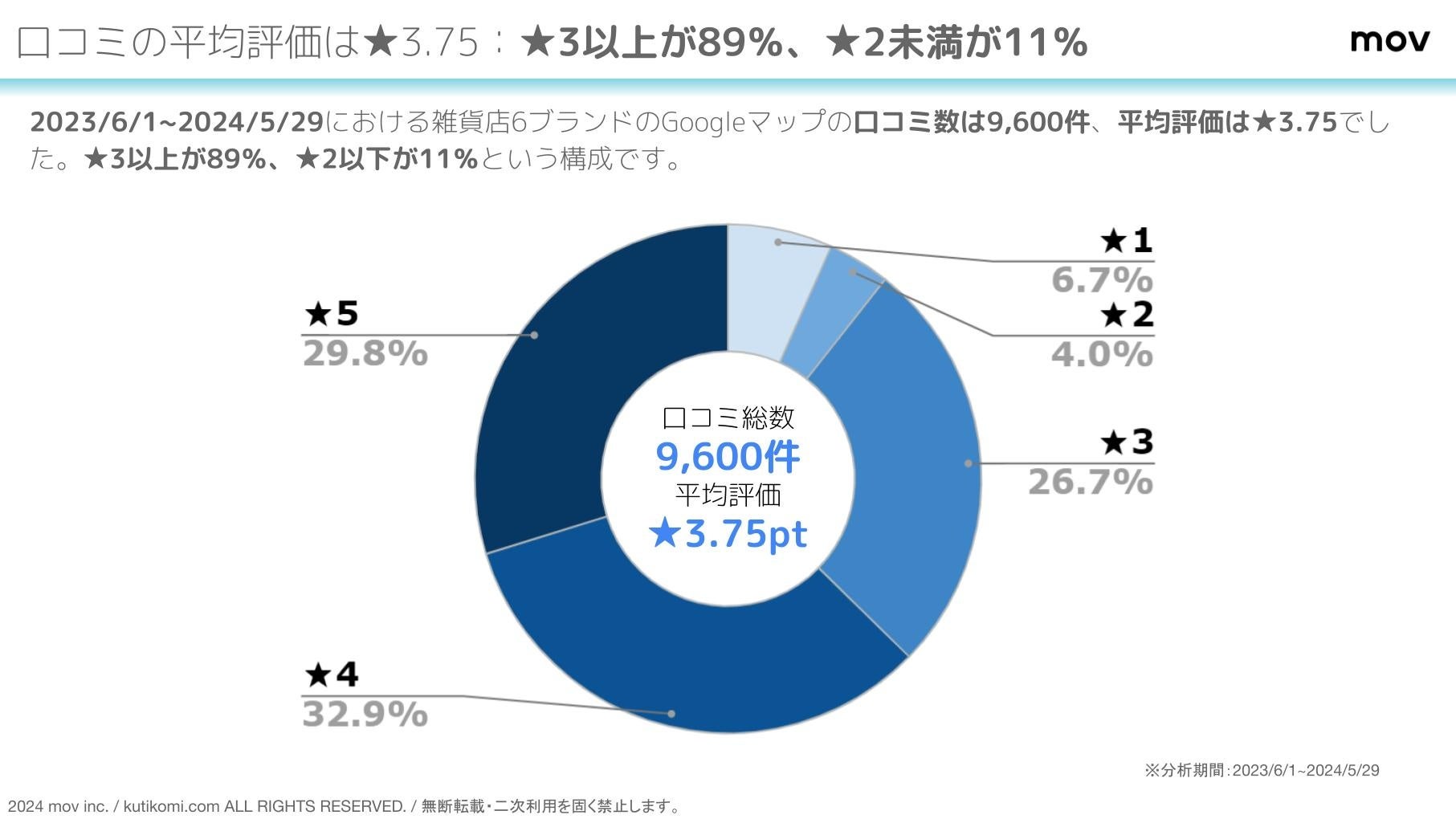 2023/6/1~2024/5/29における雑貨店6ブランドのGoogleマップの口コミ数は9,600件、平均評価は★3.75でした。★3以上が89%、★2以下が11%という構成です。