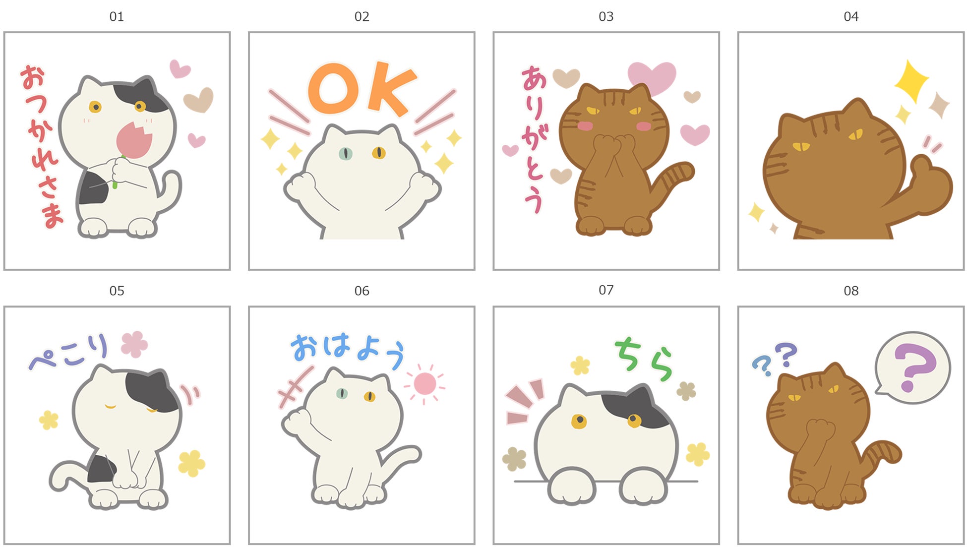 本スタンプは、「ねこと一緒に楽しくお料理!」を掲げた貝印のネコモチーフのキッチンシリーズ「Nyammy(ニャミー)」のキャラクターであるしらたま、ちまき、せんべえのLINEスタンプです。「おつかれさま」「OK」「ありがとう」「おはよう」など日常でよく使うフレーズを中心に8種類をスタンプにしました。お子様から大人までが使いやすいスタンプです。料理シーンだけではなく、日常のコミュニケーションもねこと一緒にお楽しみください。