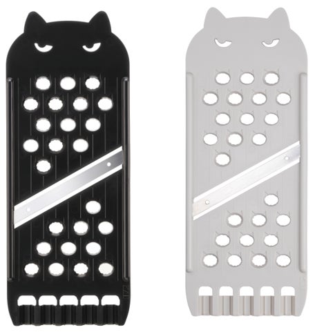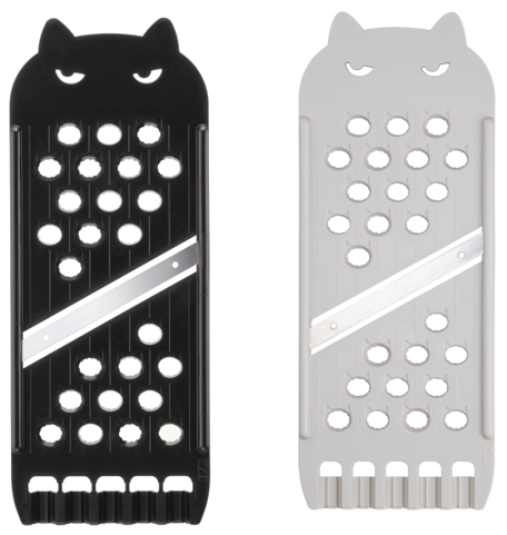 スライス・おろし・飾り切りがこれひとつででき、スピーディに切れる両刃のスライサーです。本体上部だけでなく飾り切り部分にもネコモチーフが取り入れられており、薄切りのハムやチーズをネコ型のリボン状にすることができます。