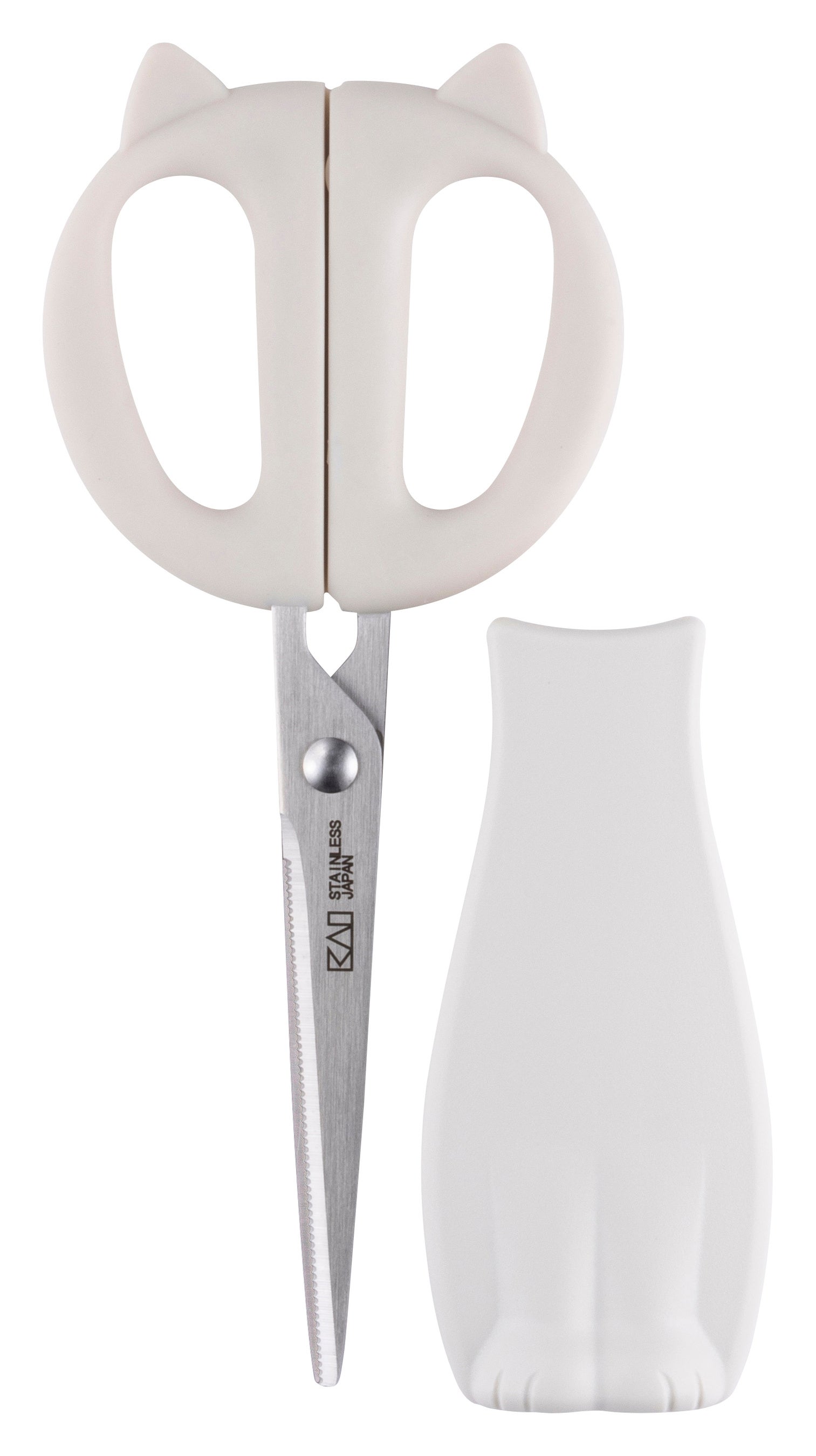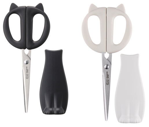 ねこがちょこんと座ったシルエットをモチーフにしたキッチンハサミです。しっかり握れるエラストマー製のハンドルと食材が滑りにくいセレーション付きの刃で、調理をばっちりサポート。
