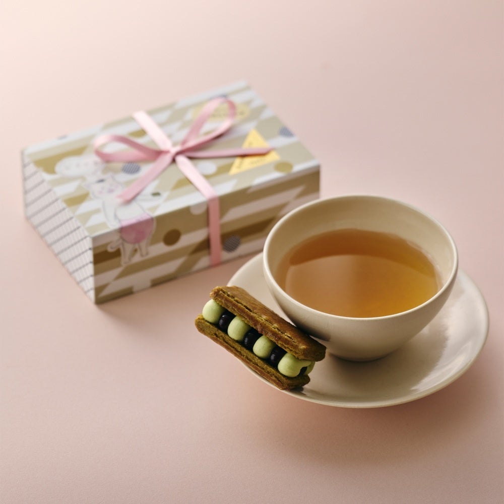 「(NO) RAISIN SANDWICH」のシグネチャーであるレーズンサンドと、京都〈一保堂茶舖〉のほうじ茶が出会いました。ほうじ茶ミルクジャムに、ほうじ茶サブレのブラウンな香ばしさと、レーズンのジューシーなコントラストが眩しい仕上がりです。