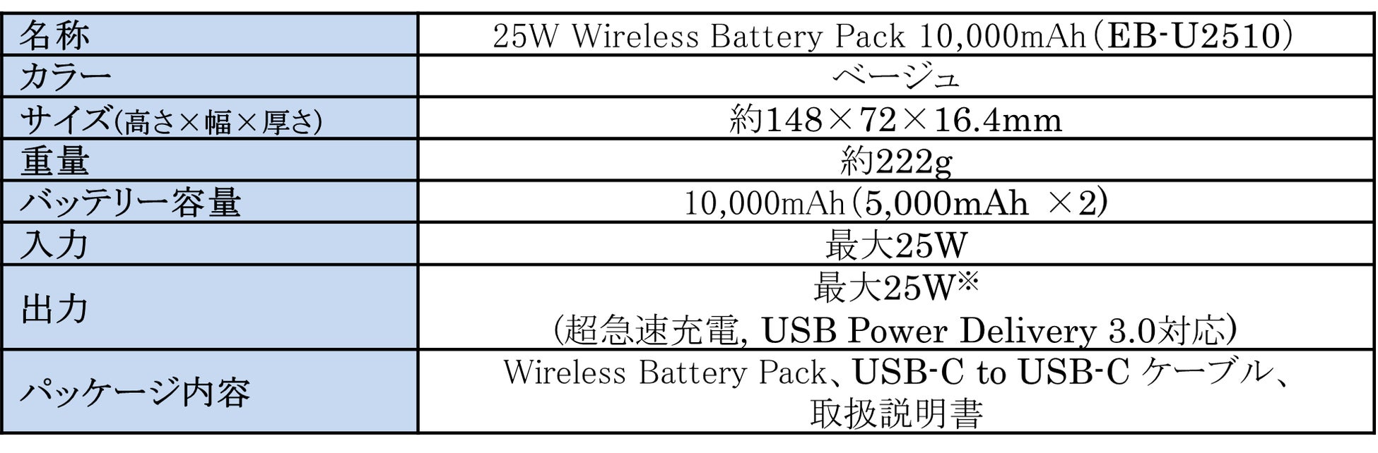 <主な仕様:「25W Wireless Battery Pack 10,000mAh(EB-U2510)」>