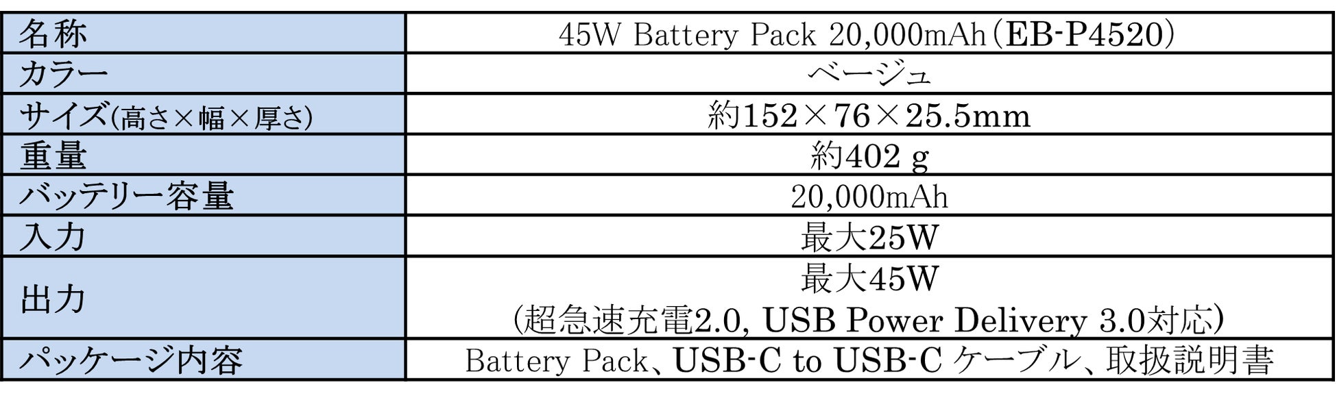 <主な仕様:「45W Battery Pack 20,000mAh(EB-P4520)」>